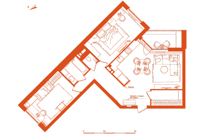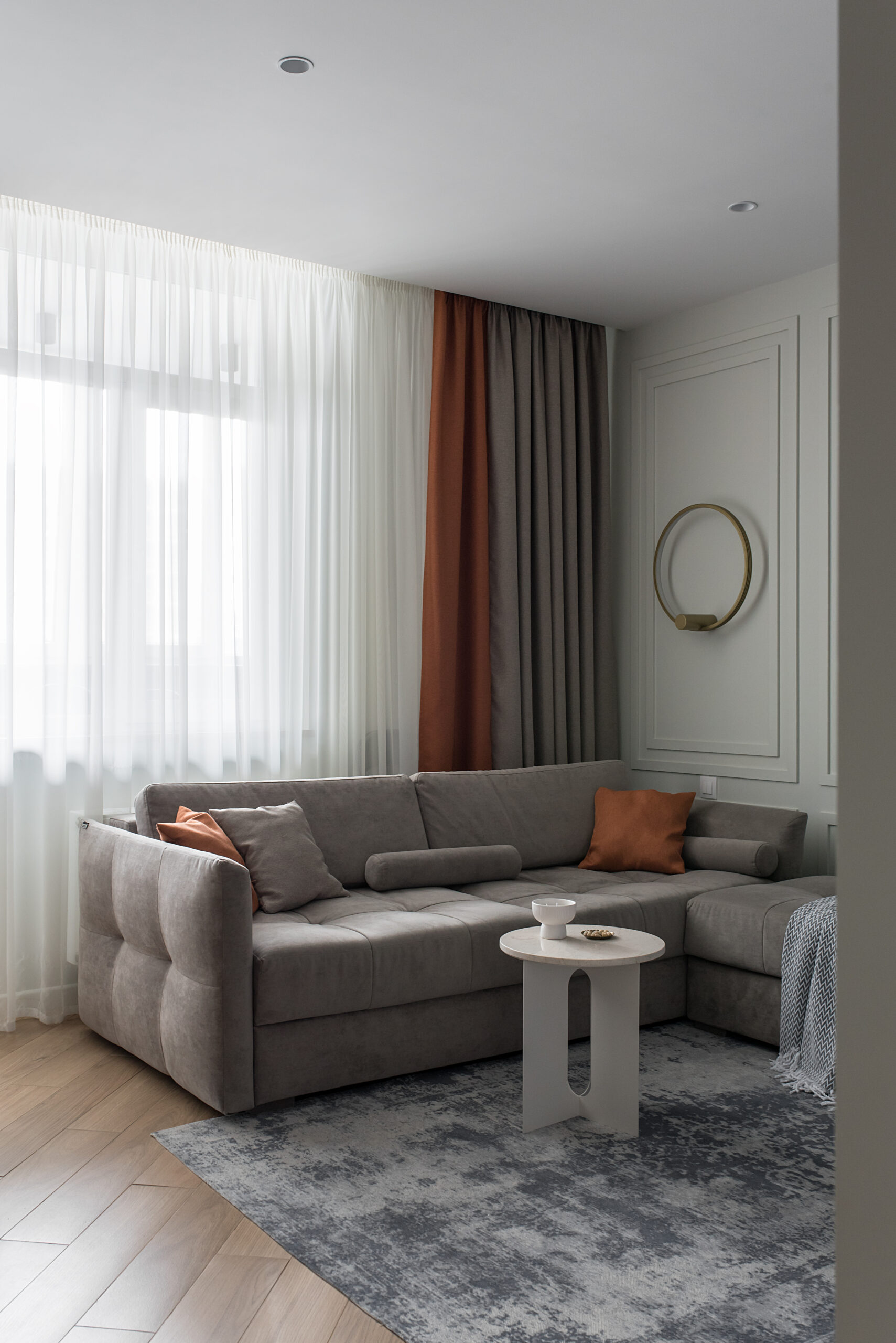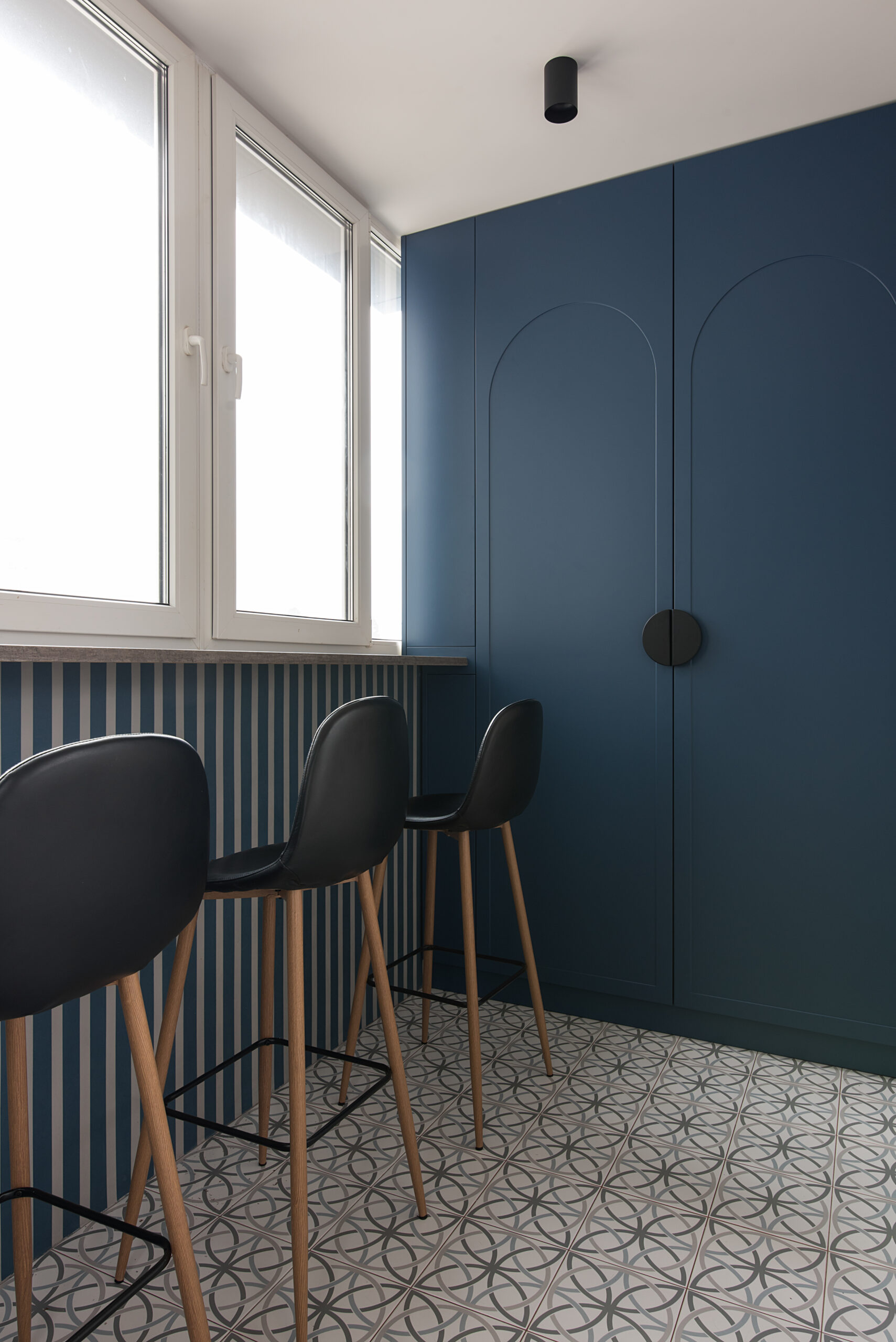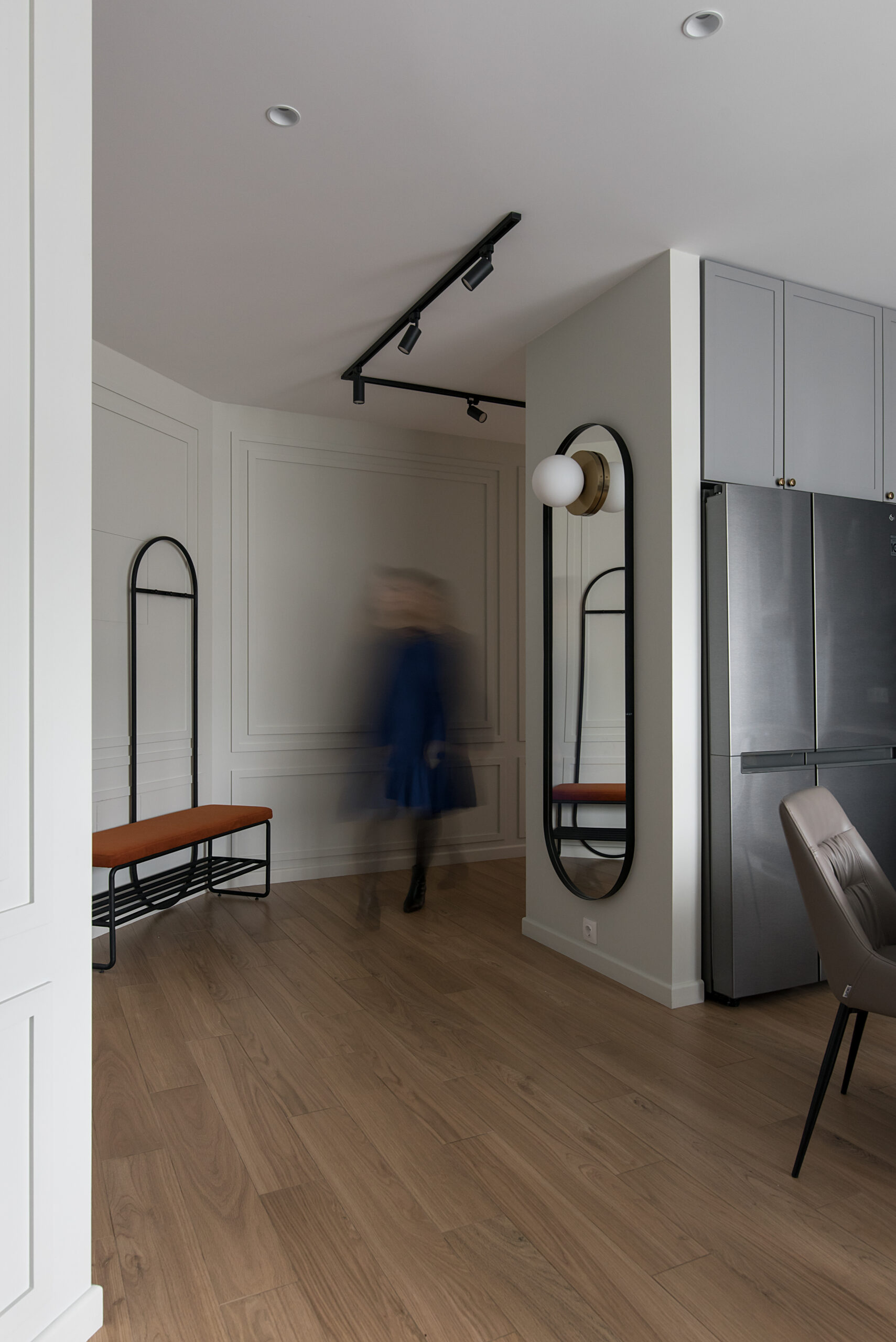 Завдяки переплануванню команда Luka Design об’єднала кухню з однією з кімнат, створивши відкритий простір з вхідною зоною, кухнею та вітальнею. Додаткове засклення наповнило квартиру денним світлом, а біля входу з’явилась гардеробна.