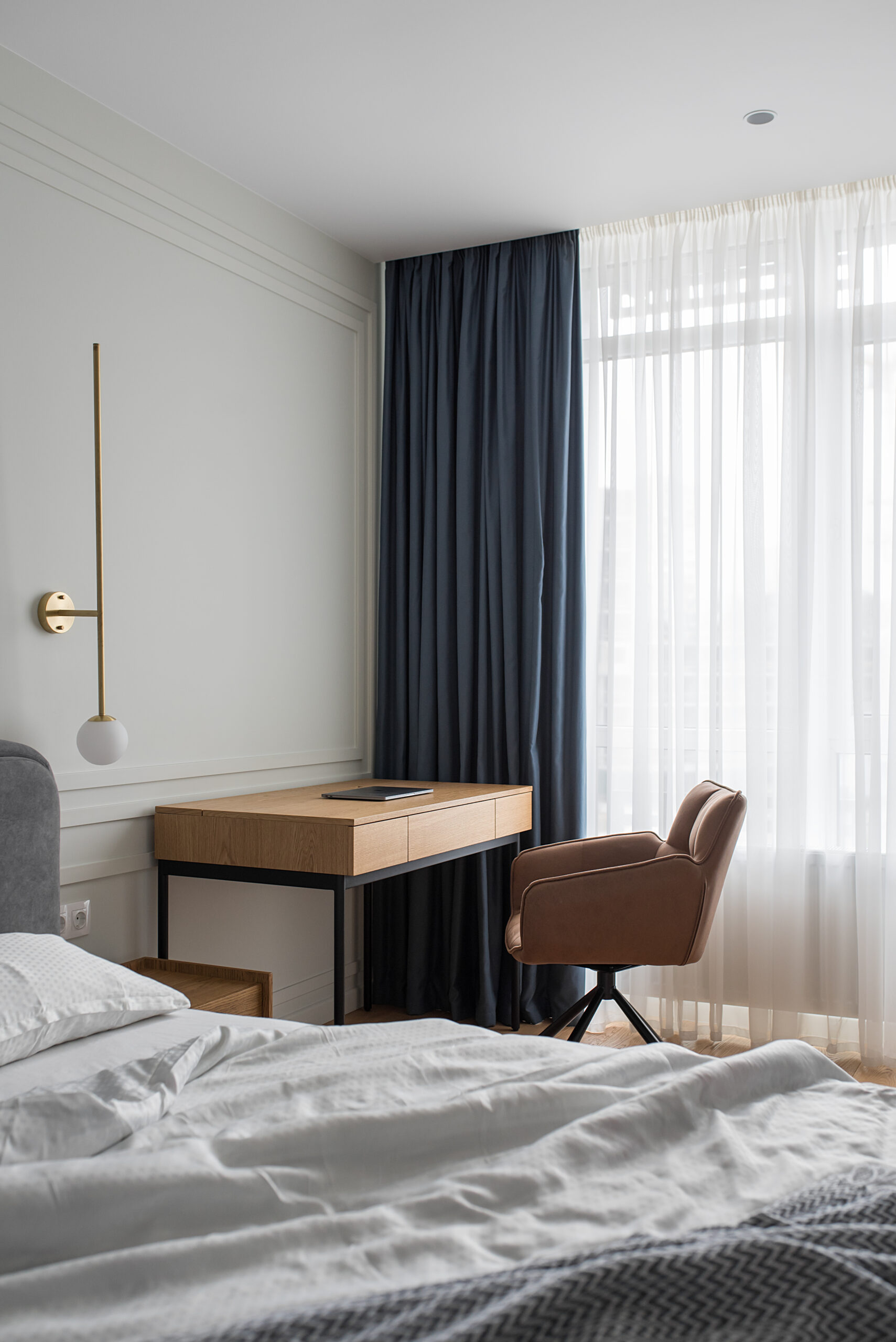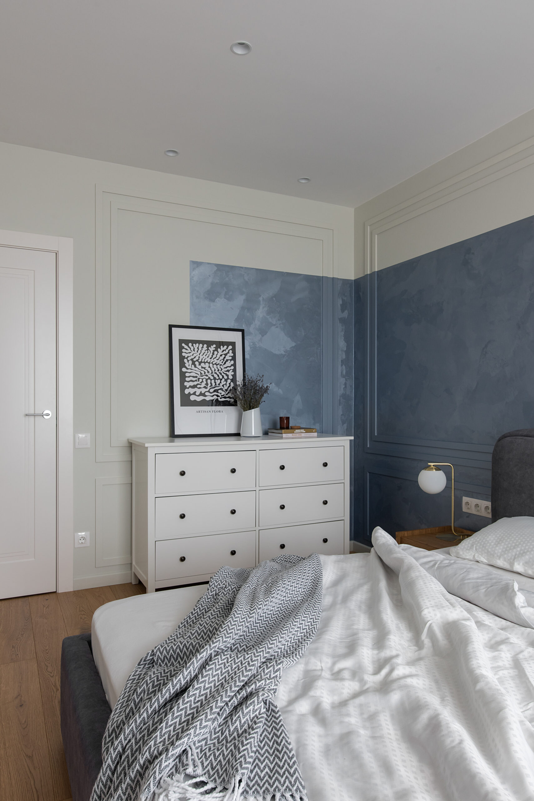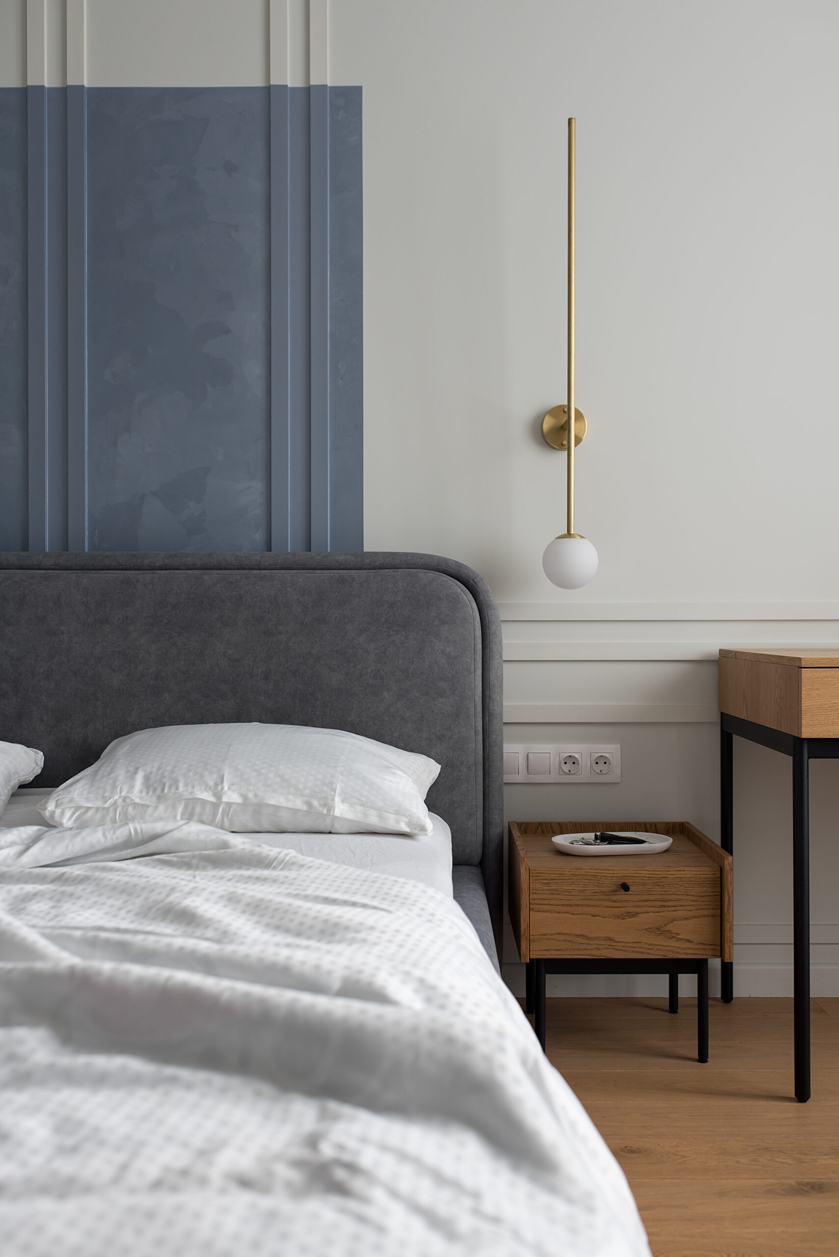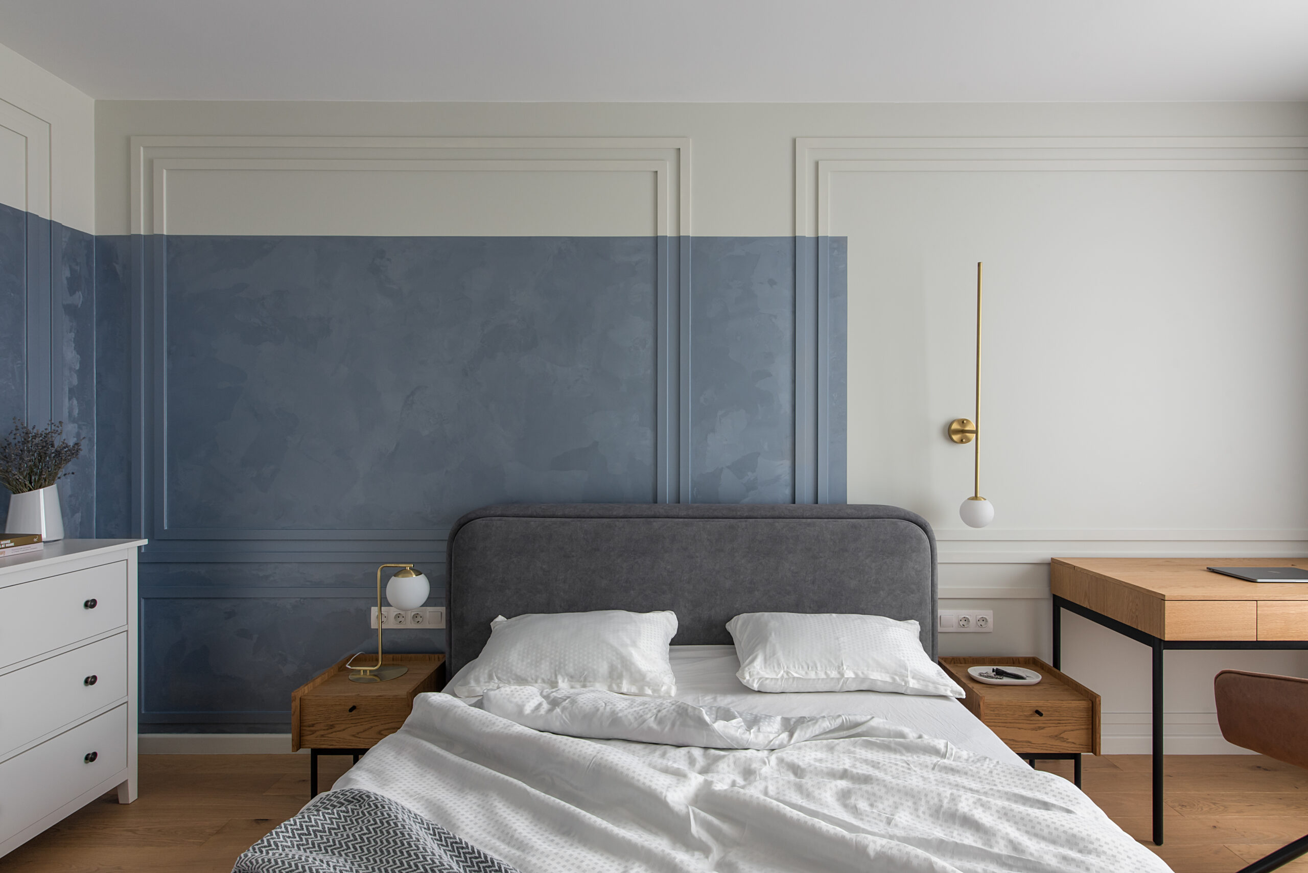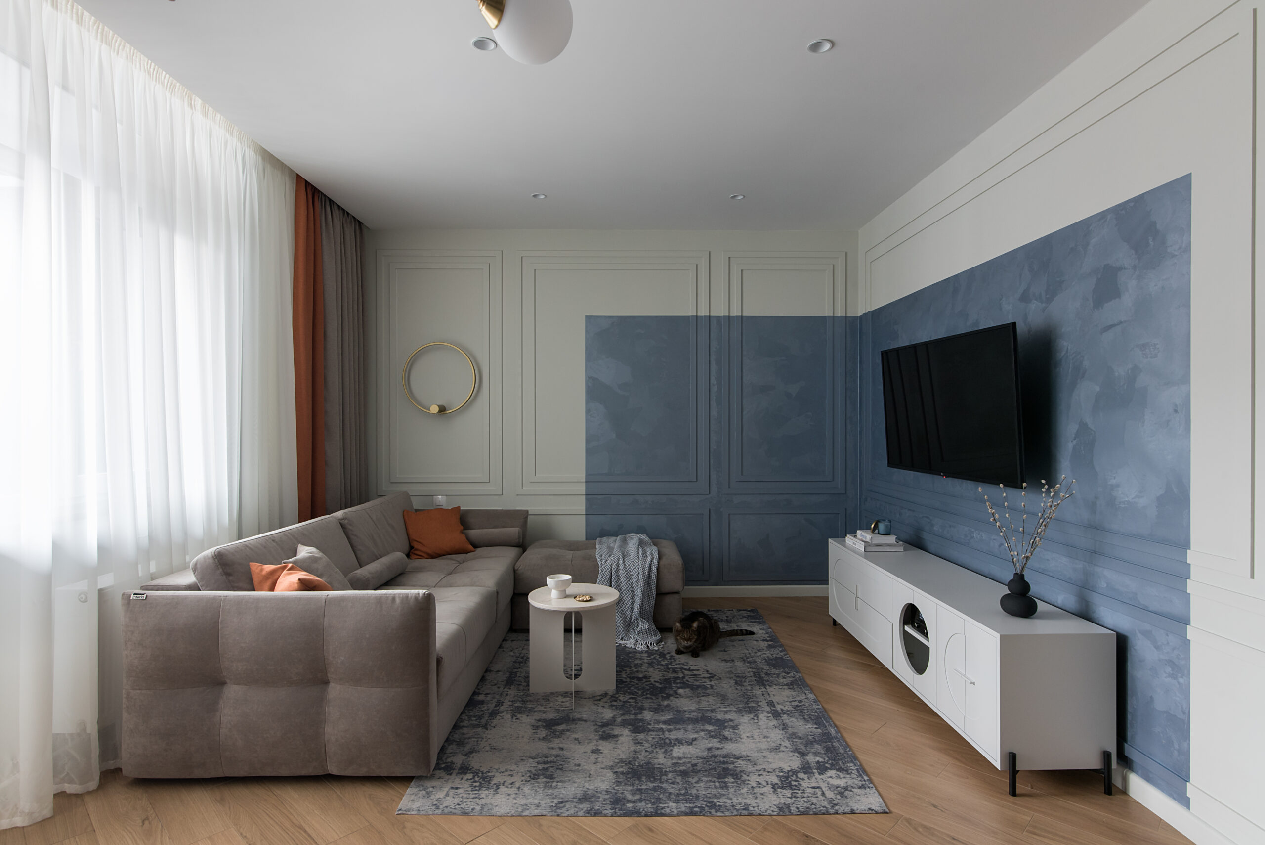 Інтер’єр побудовано на контрастах: світла база поєднується з насиченим синім, чорними акцентами та деталями в латуні. У спальнях і загальних зонах — настінні молдинги та декоративне тинькування, у санвузлах — мікроцемент.