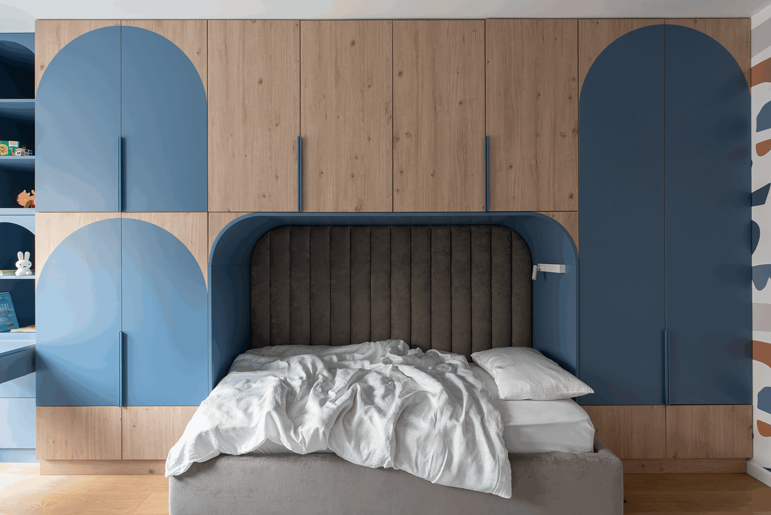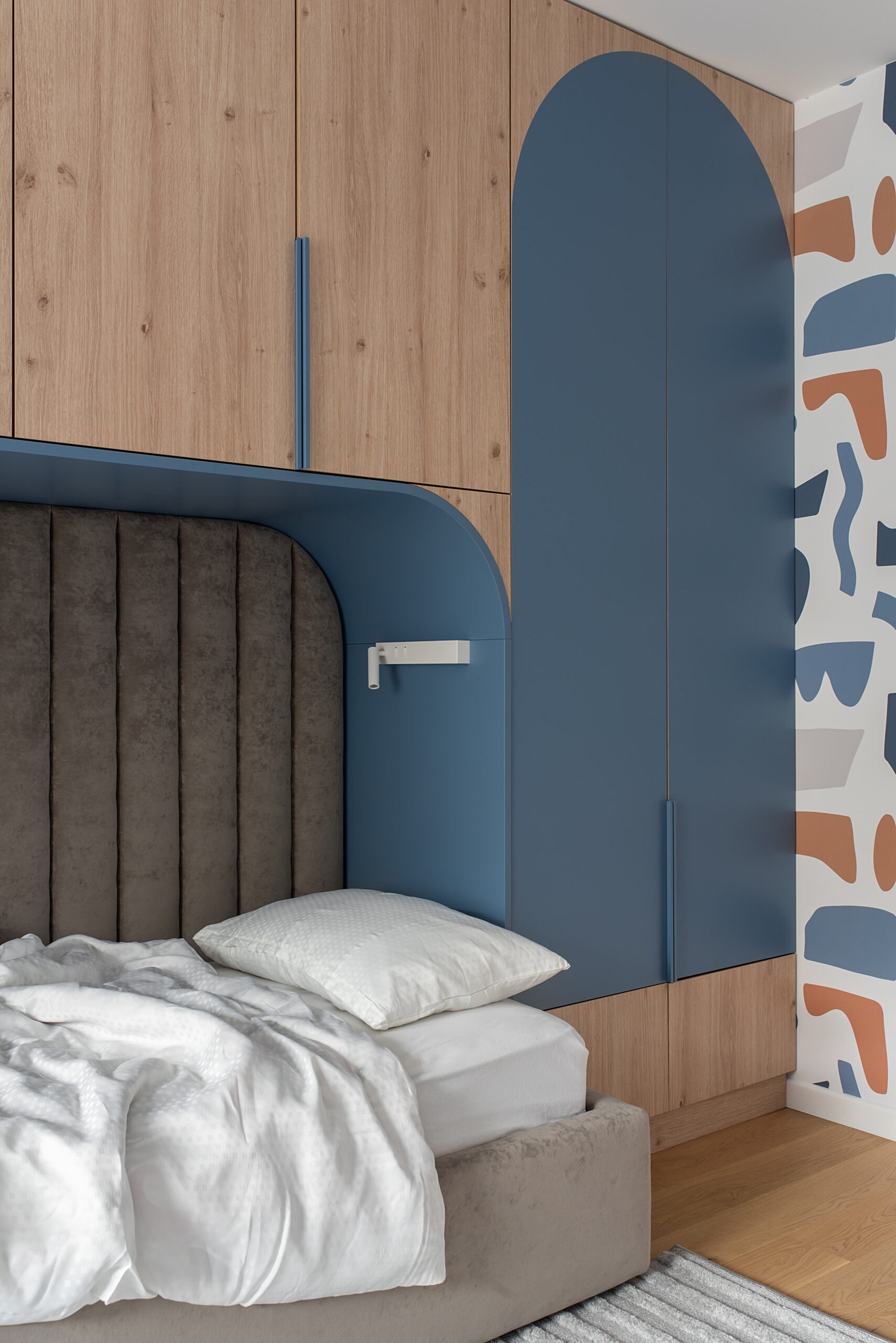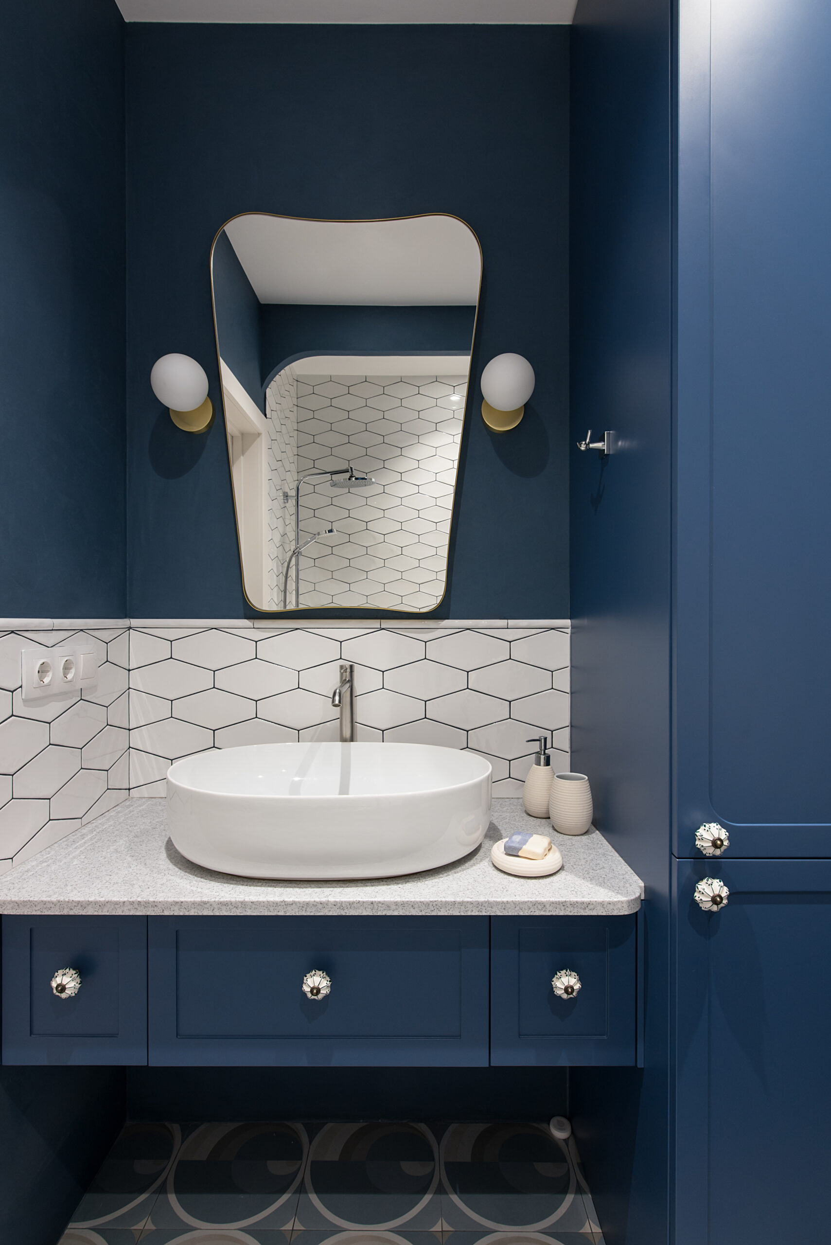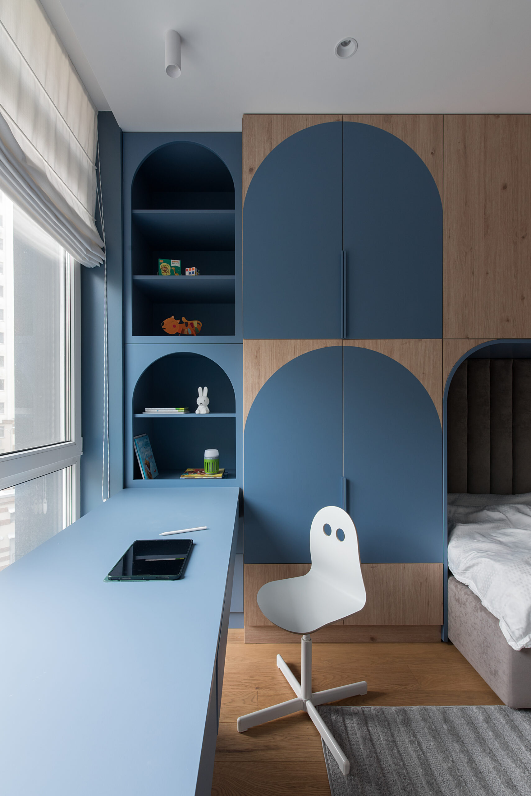 Інтер’єр побудовано на контрастах: світла база поєднується з насиченим синім, чорними акцентами та деталями в латуні. У спальнях і загальних зонах — настінні молдинги та декоративне тинькування, у санвузлах — мікроцемент.