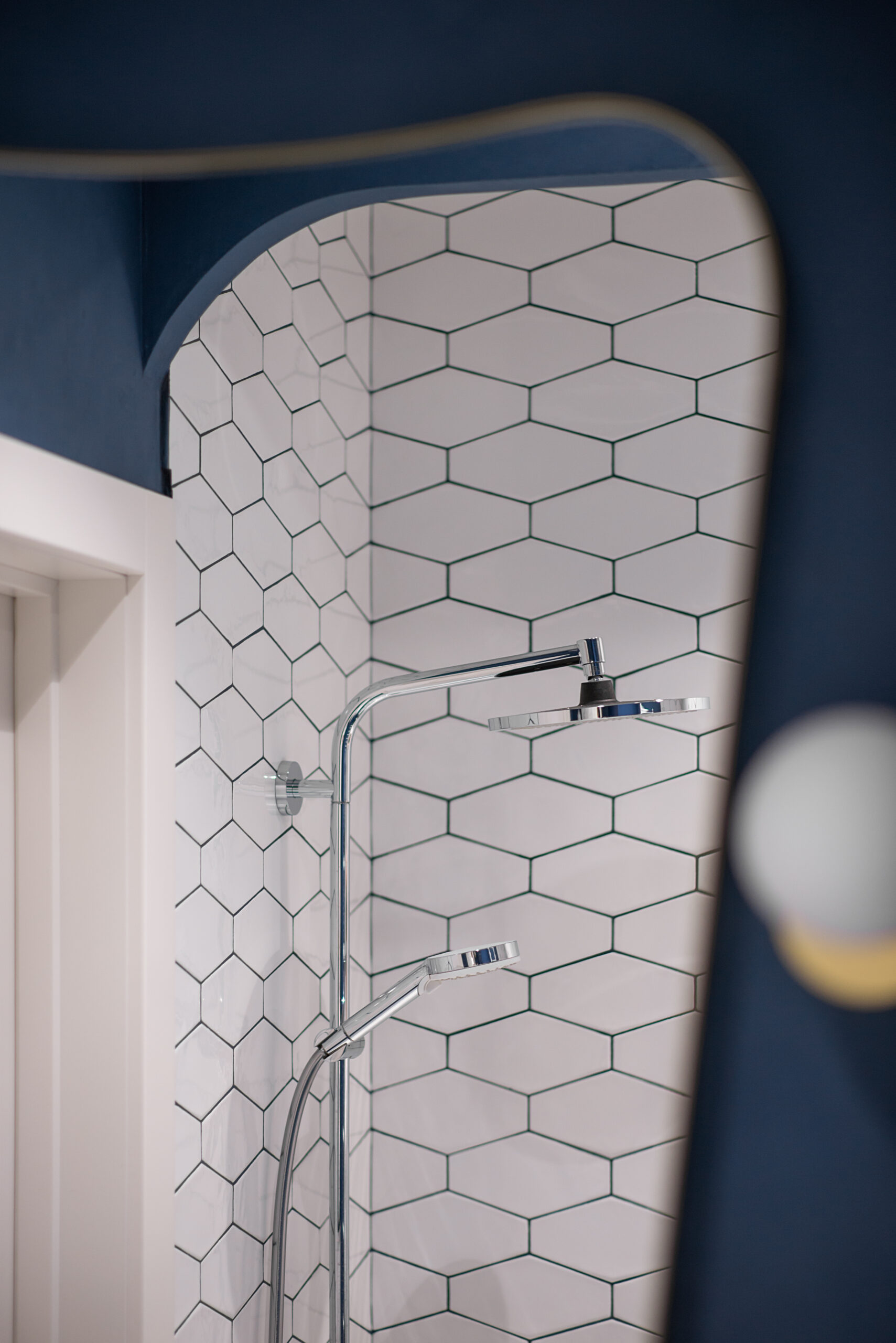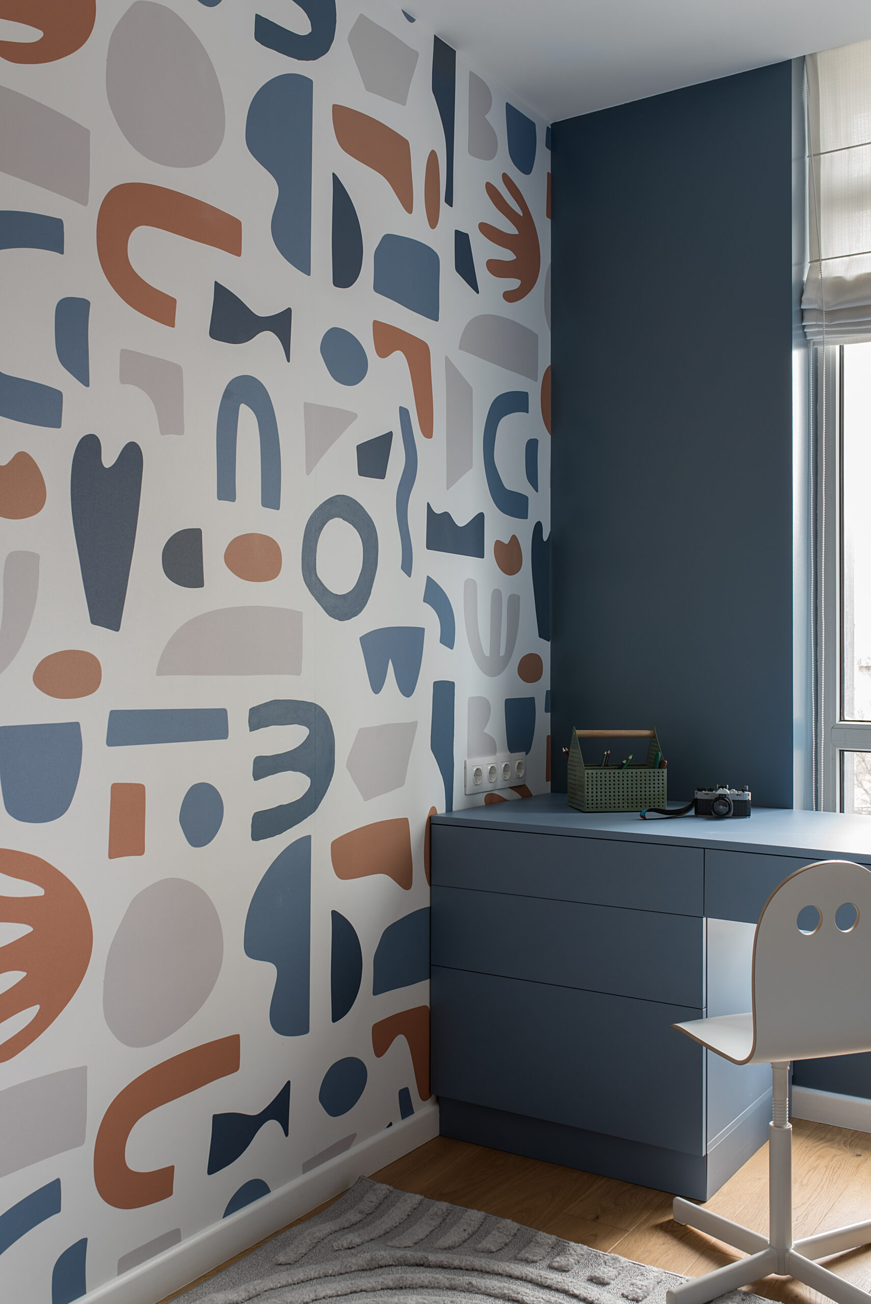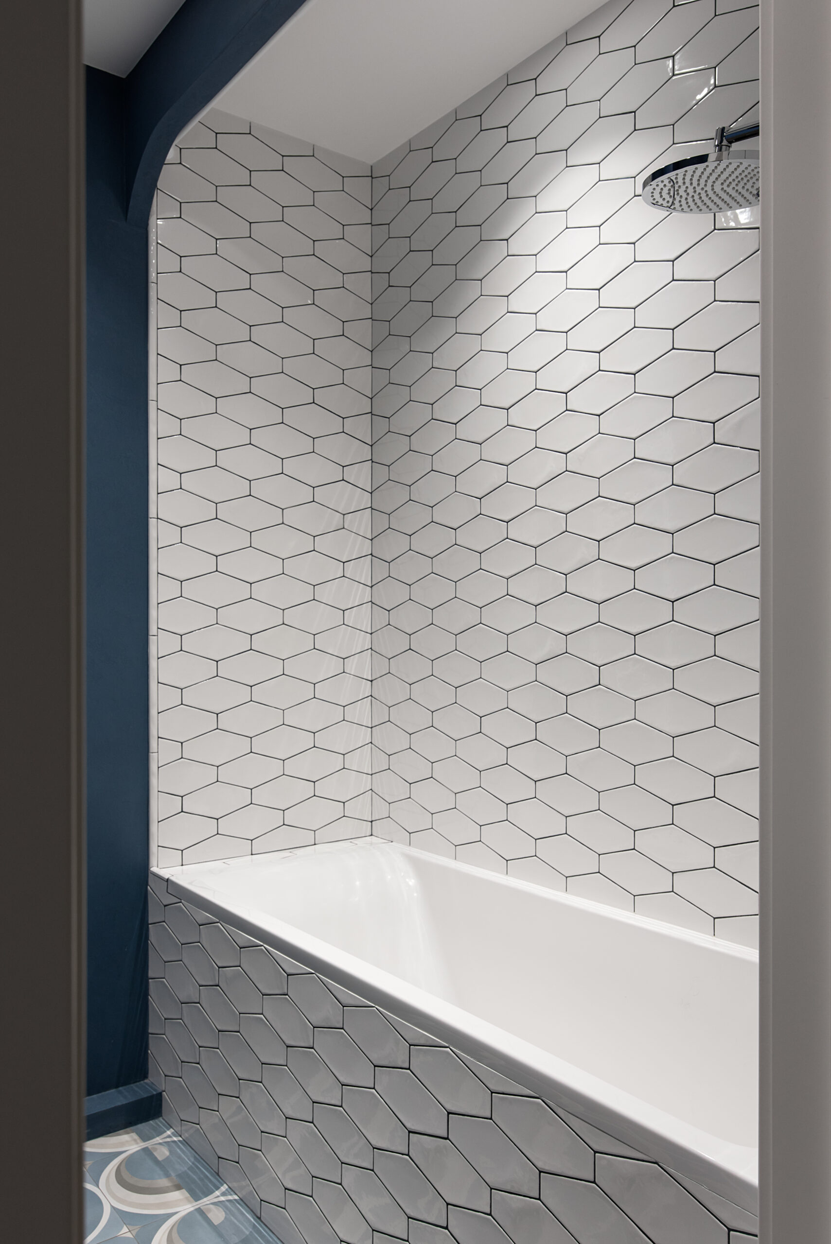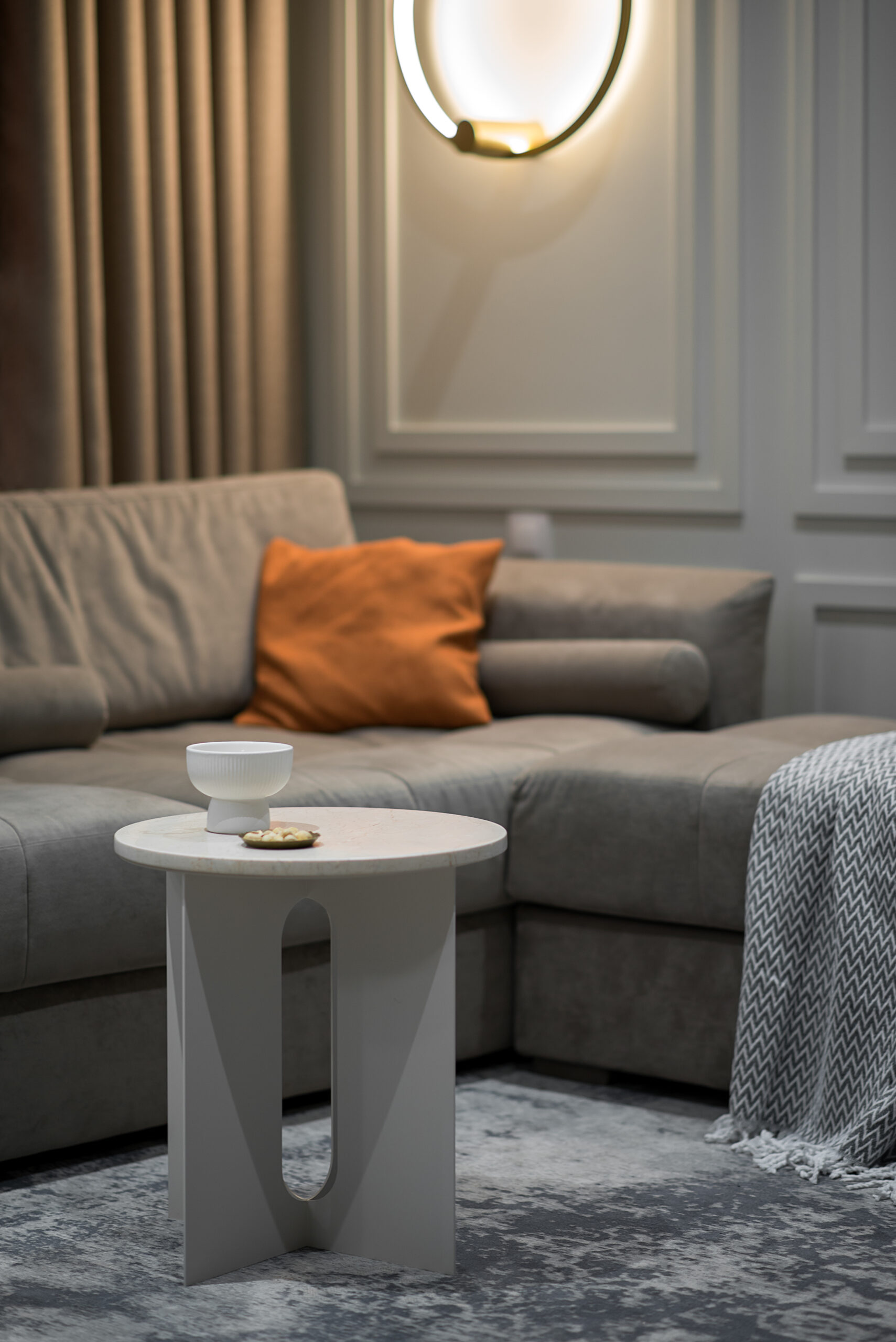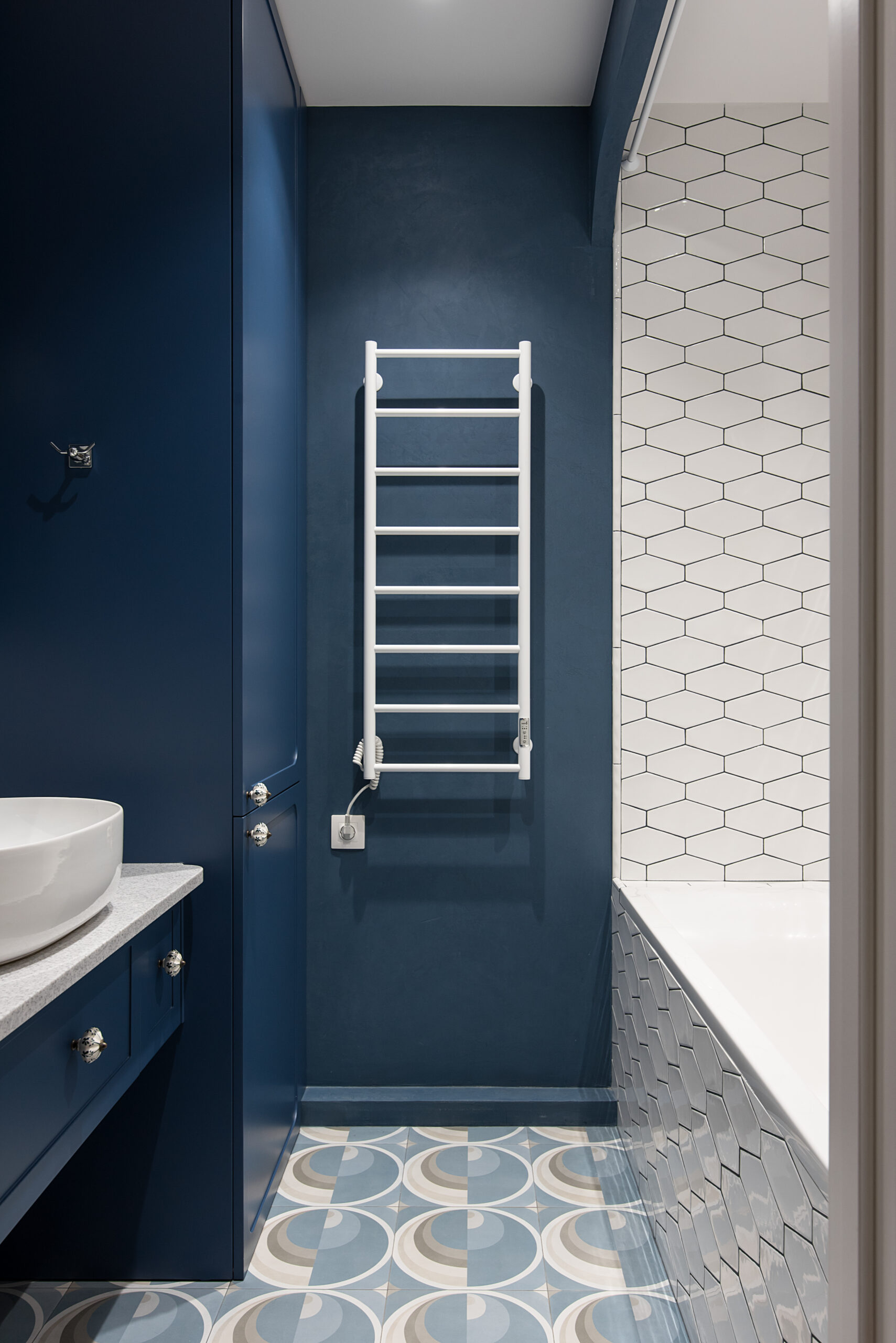 Інтер’єр побудовано на контрастах: світла база поєднується з насиченим синім, чорними акцентами та деталями в латуні. У спальнях і загальних зонах — настінні молдинги та декоративне тинькування, у санвузлах — мікроцемент.