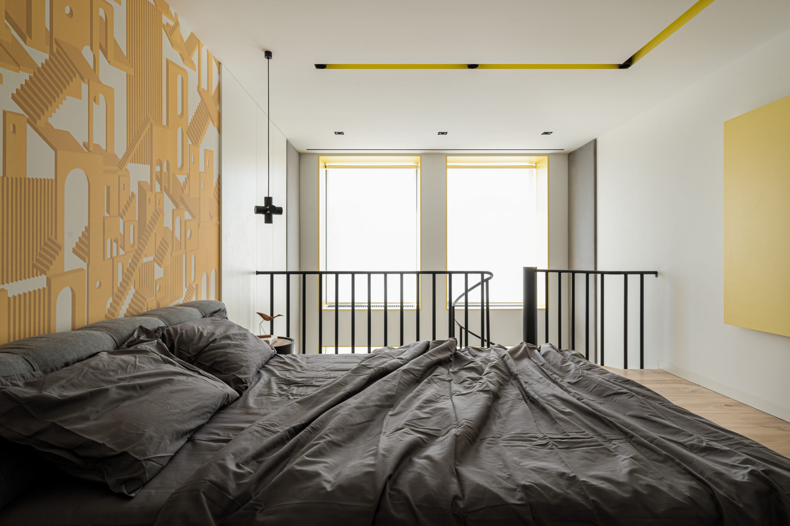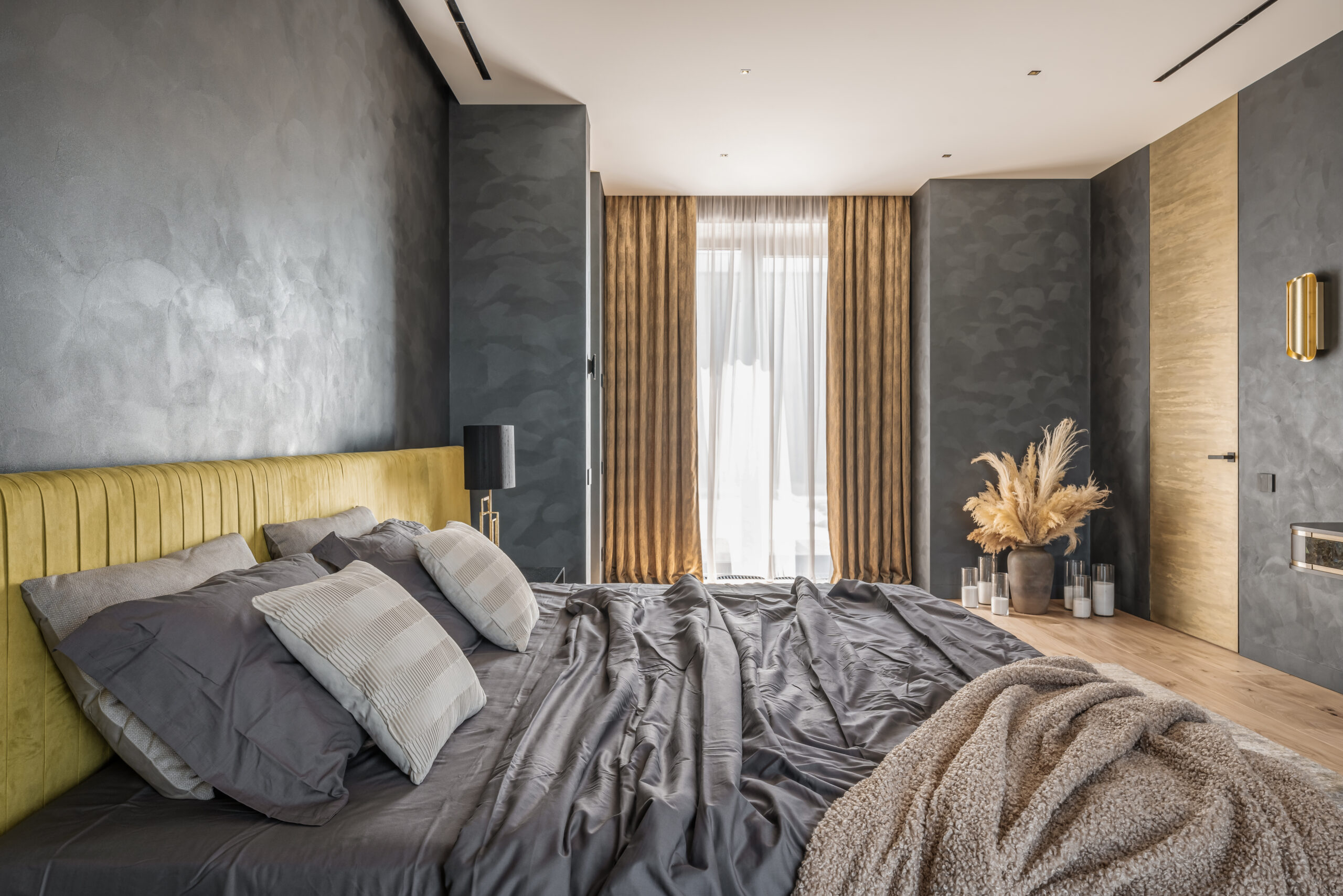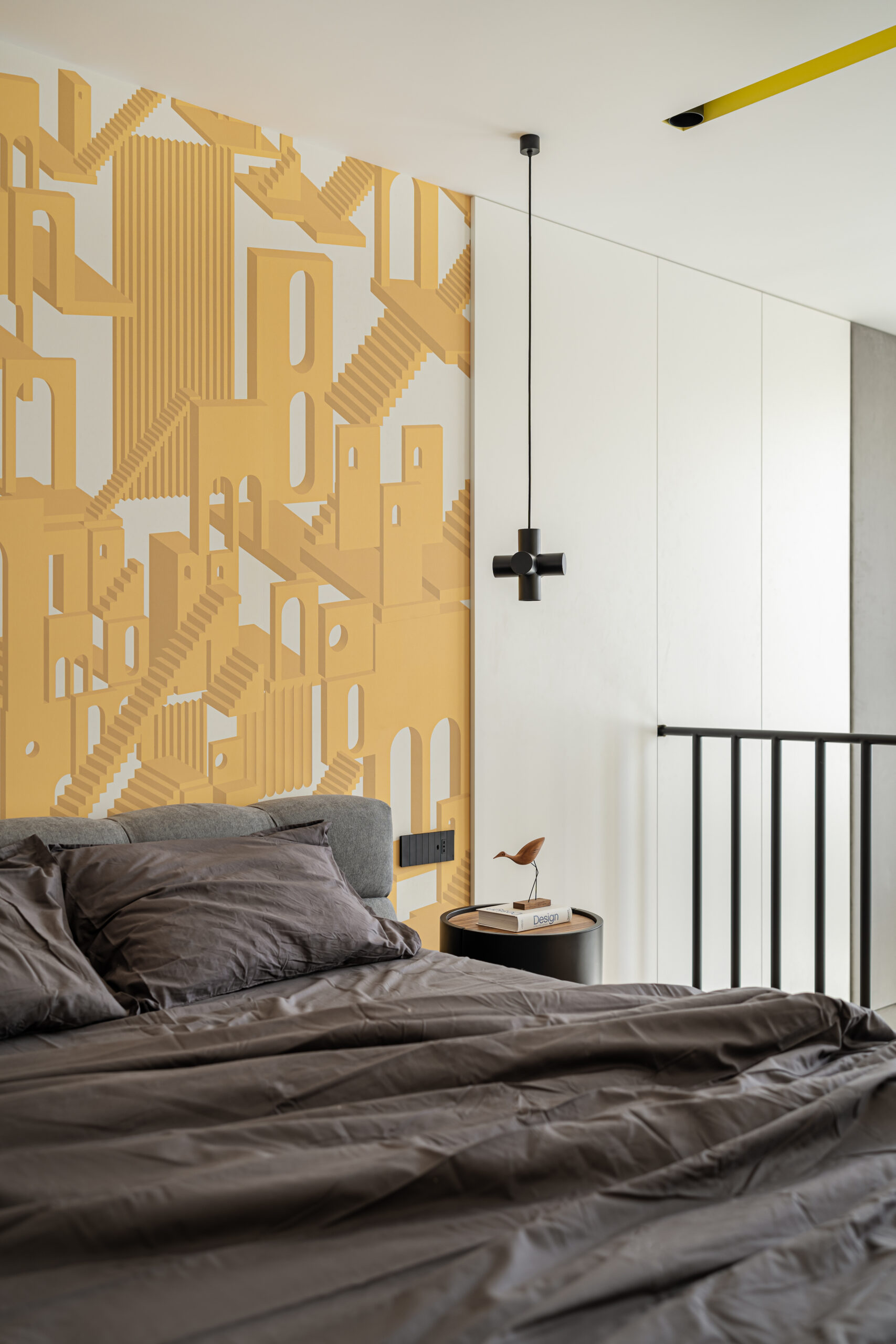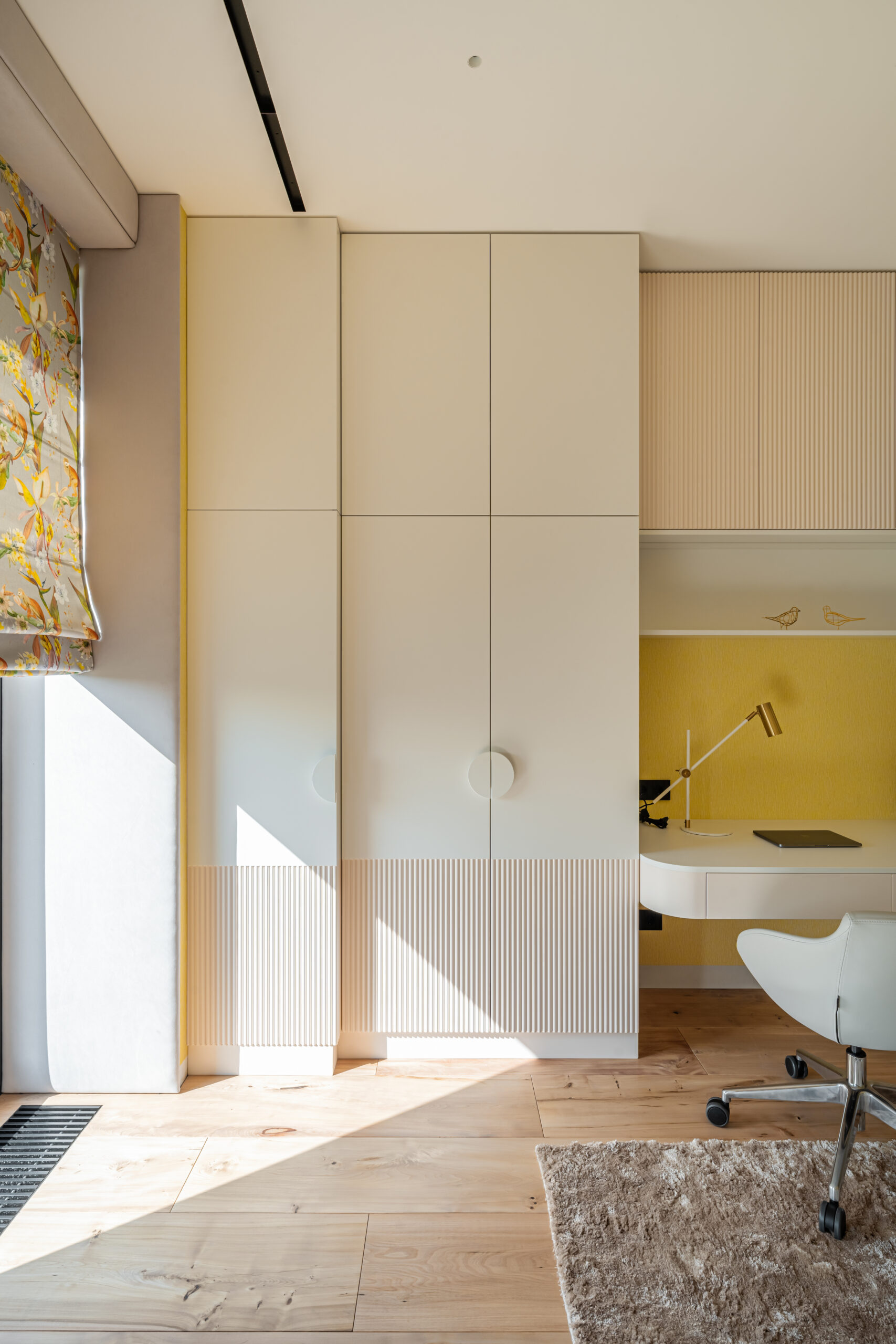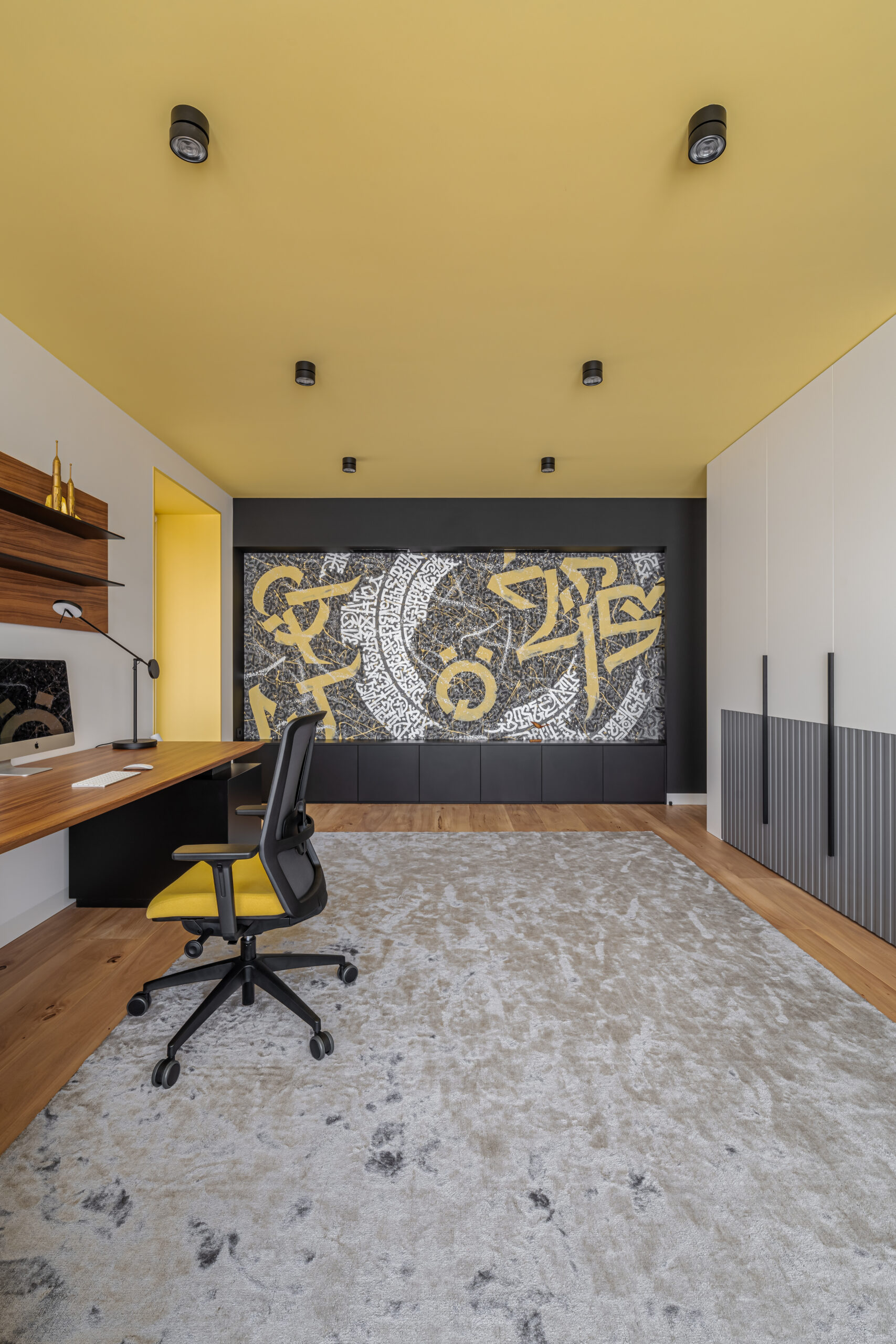 Дизайн кімнати старшого сина втілює його інтереси: графіті, сіро-жовта кольорова гама та унікальна настінна каліграфія художника Олександра Стіа. «Каліграфія — це медитація. Глядач сприймає форми та композицію, що викликають емоції», — зазначає автор роботи.