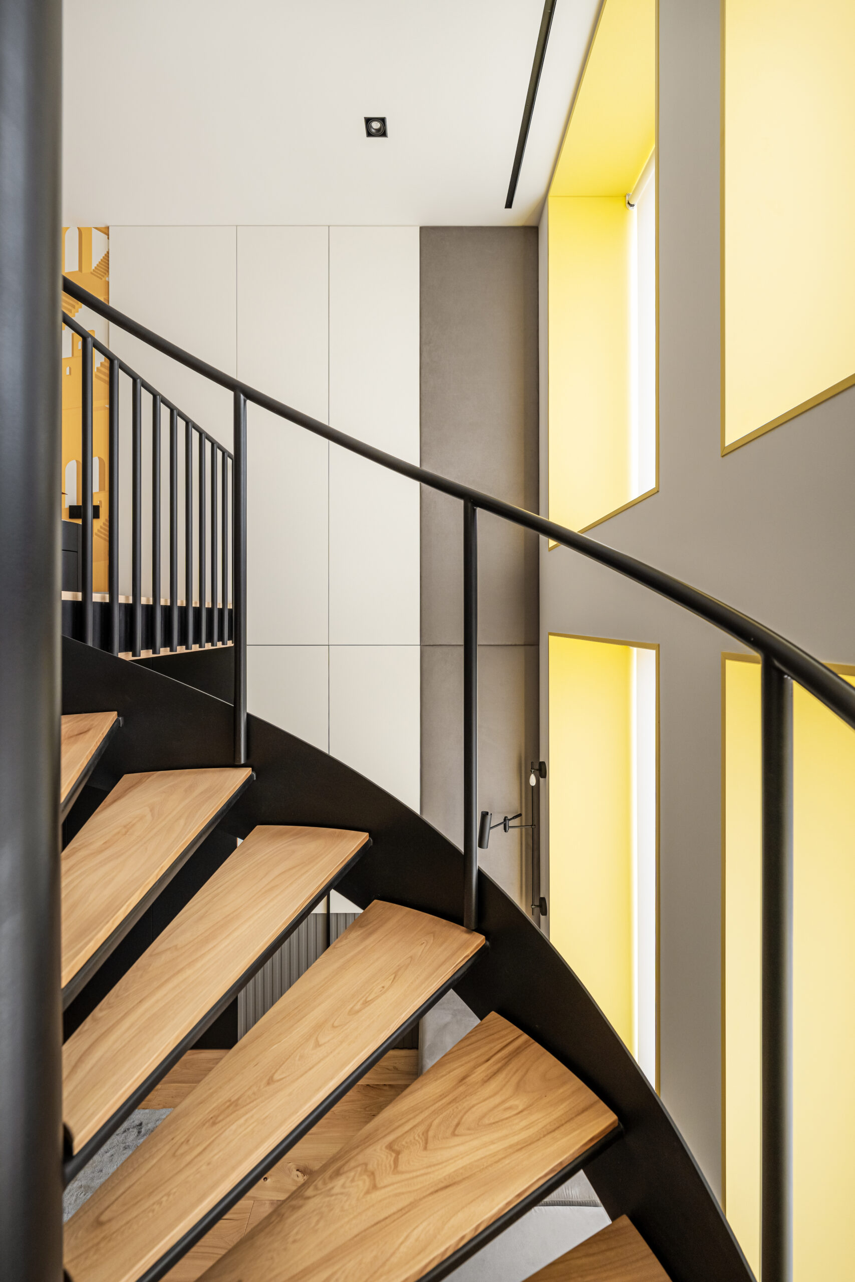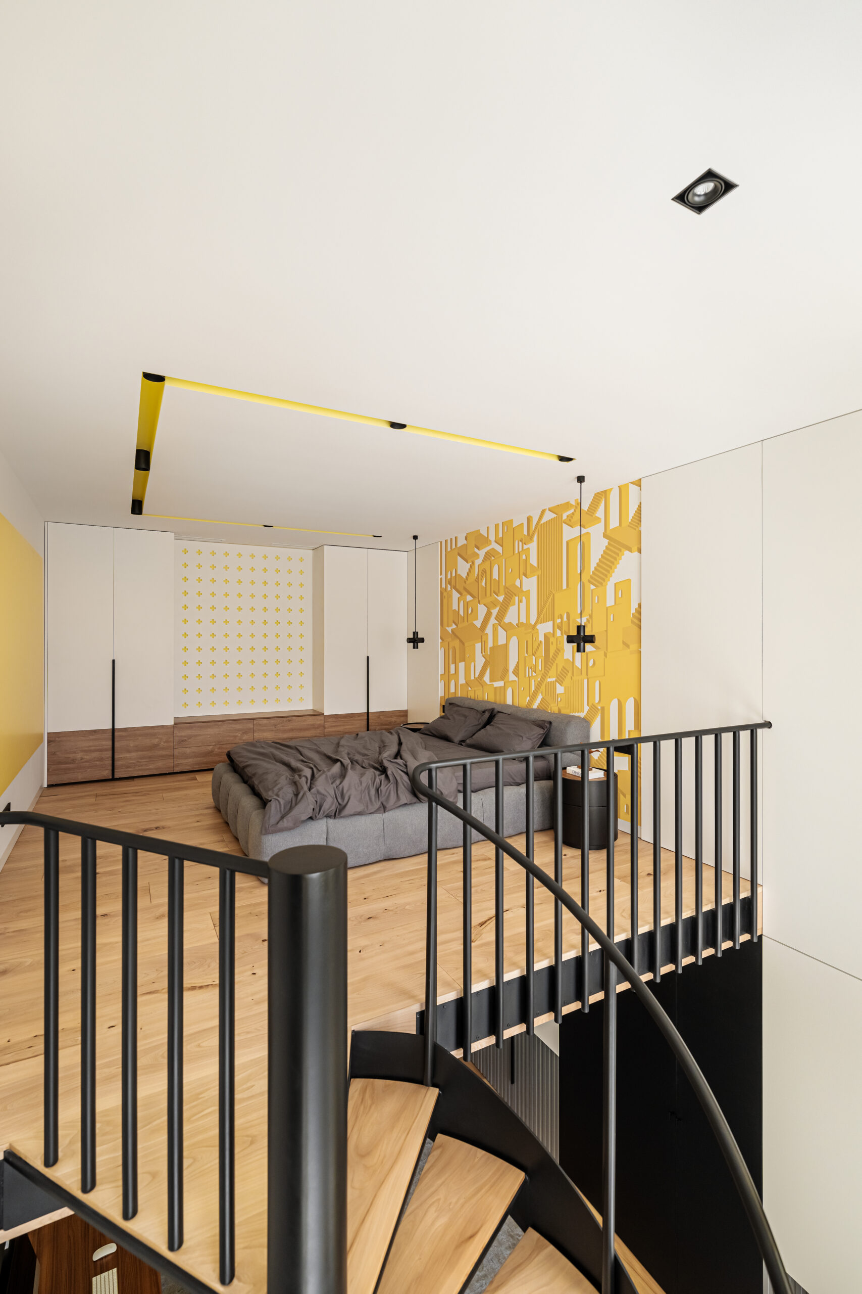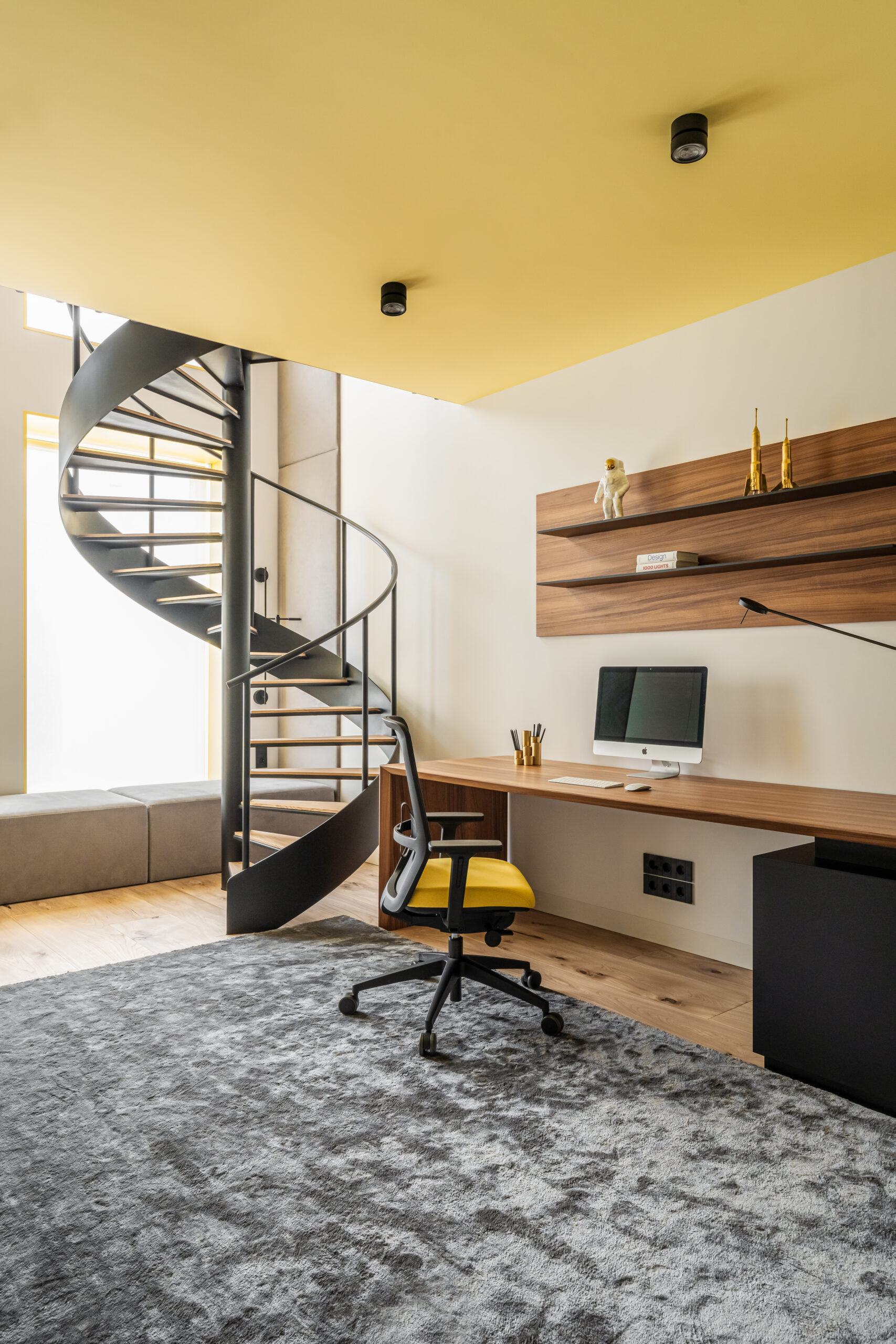 Двоповерхова кімната розділена на зони: перший ярус для навчання, другий — для відпочинку. Рівні з’єднують металеві гвинтові сходи, створені за індивідуальними ескізами.