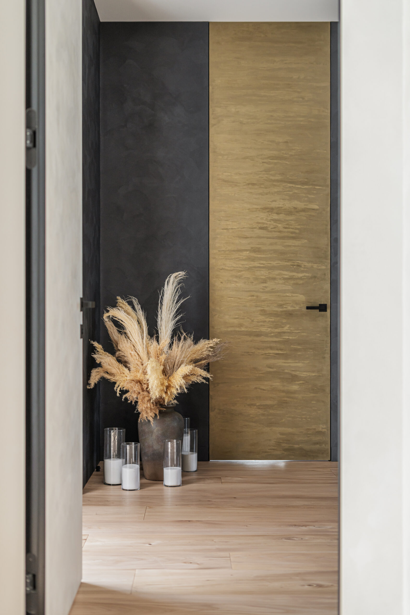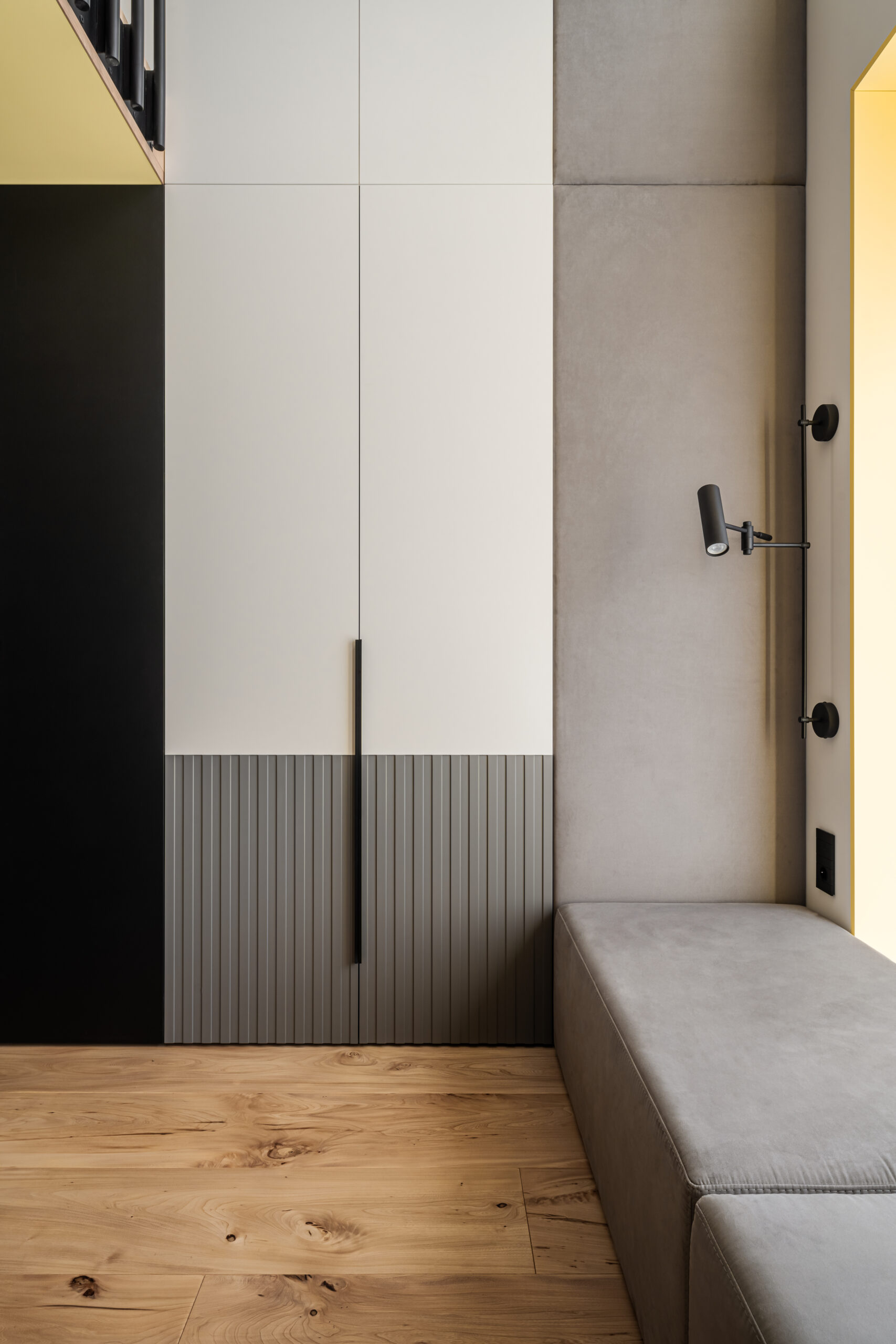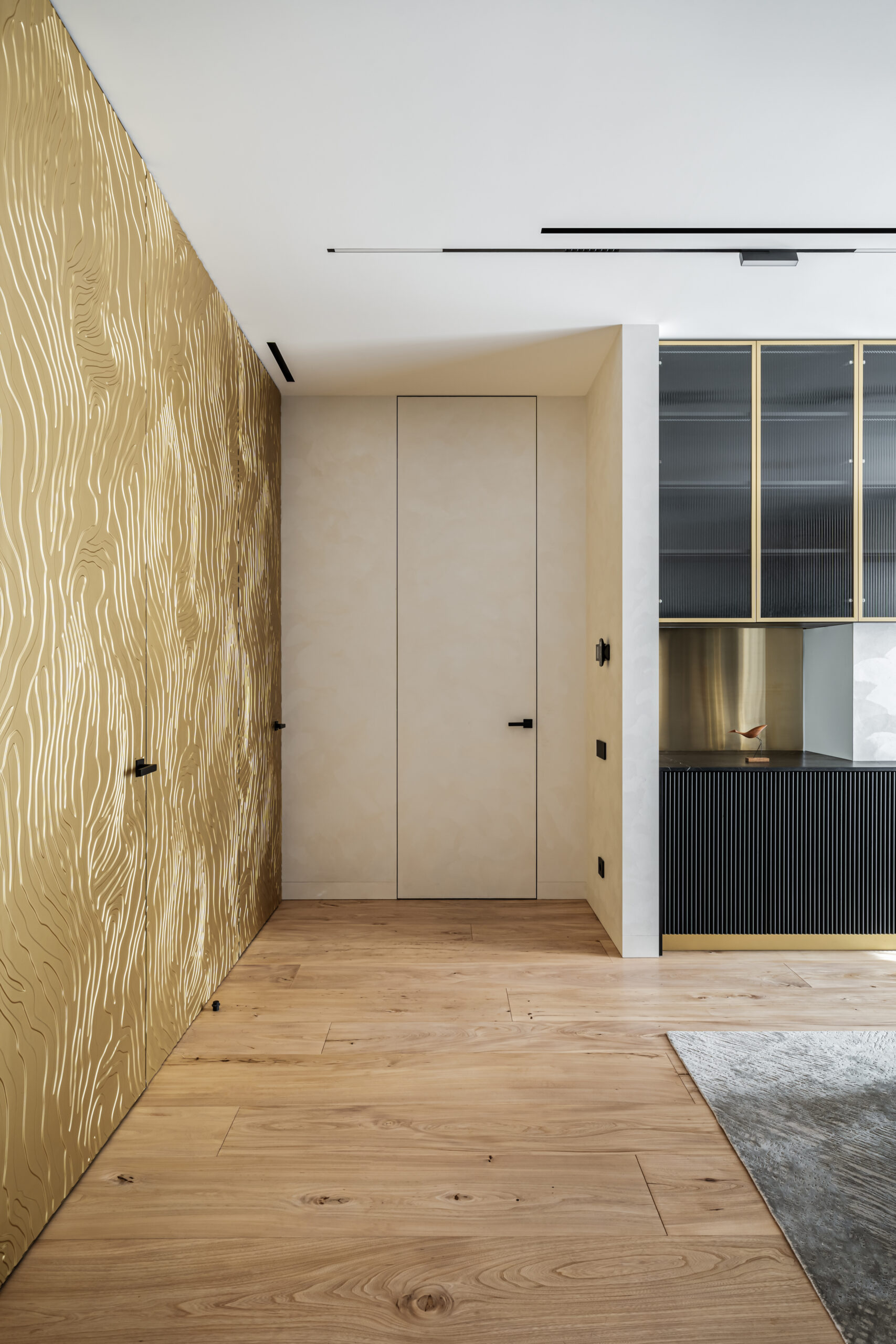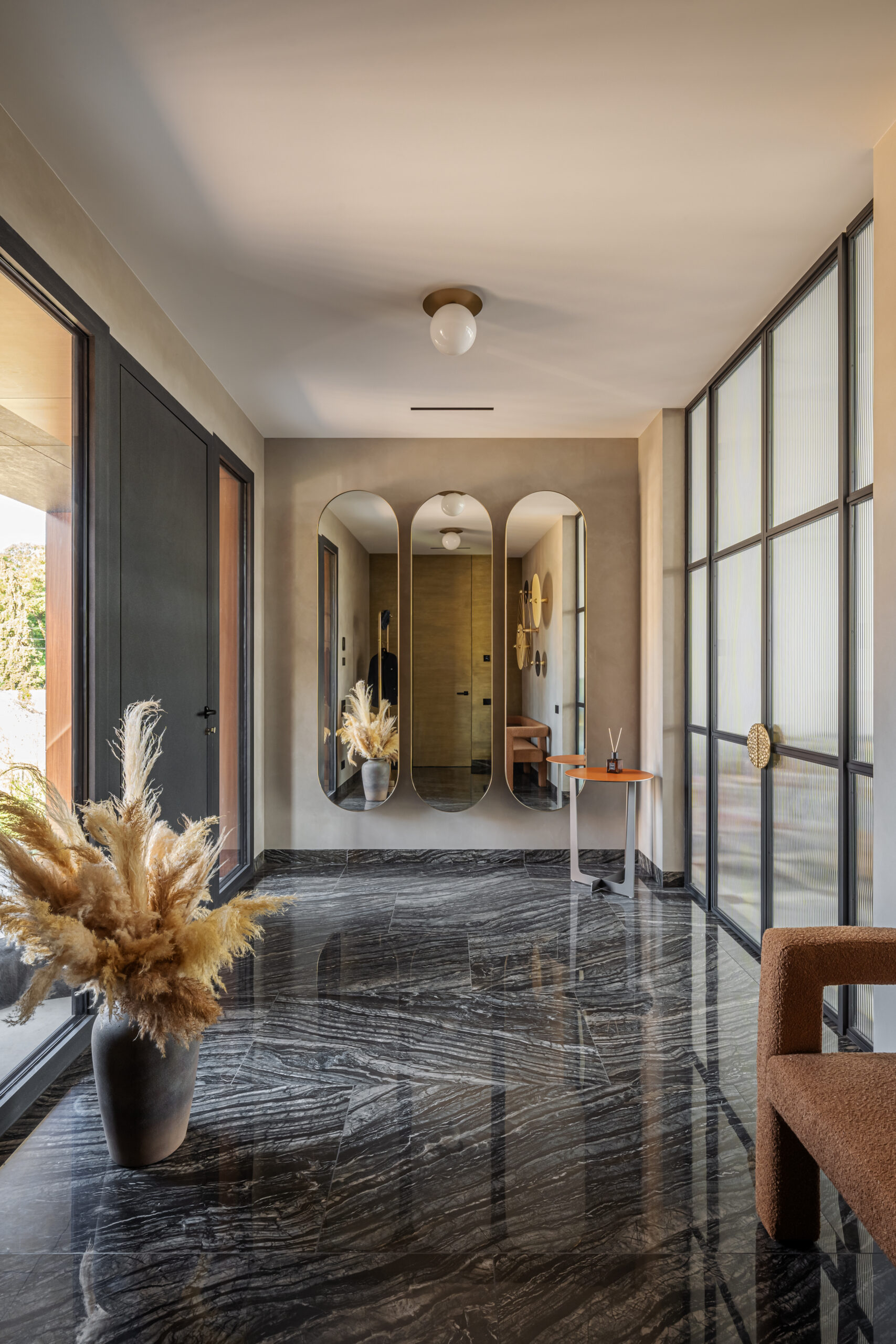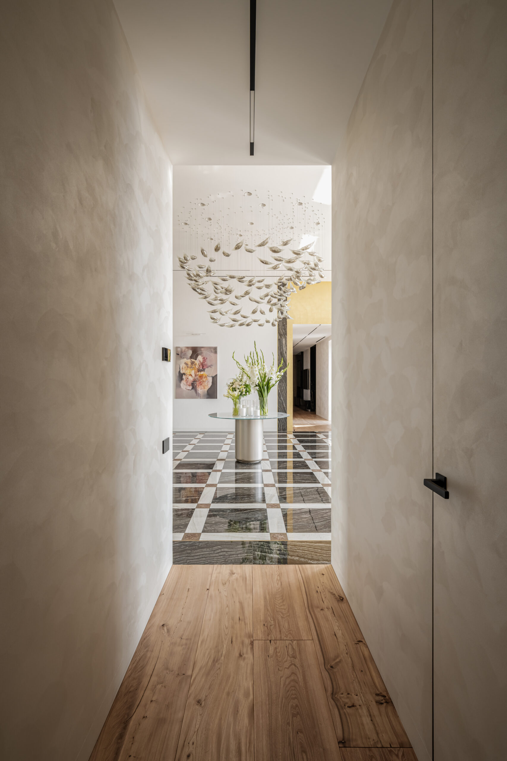 Передпокій наповнений артистичним світлом: бра від Aromas del Campo та стельові світильники Nuura додають об’єму, а кольору — столик від Poltrona Frau. Унікальні меблі — підлоговий вішак із мармуровою полицею, тріо дзеркал та банкетка — створені за ескізами дизайнера.