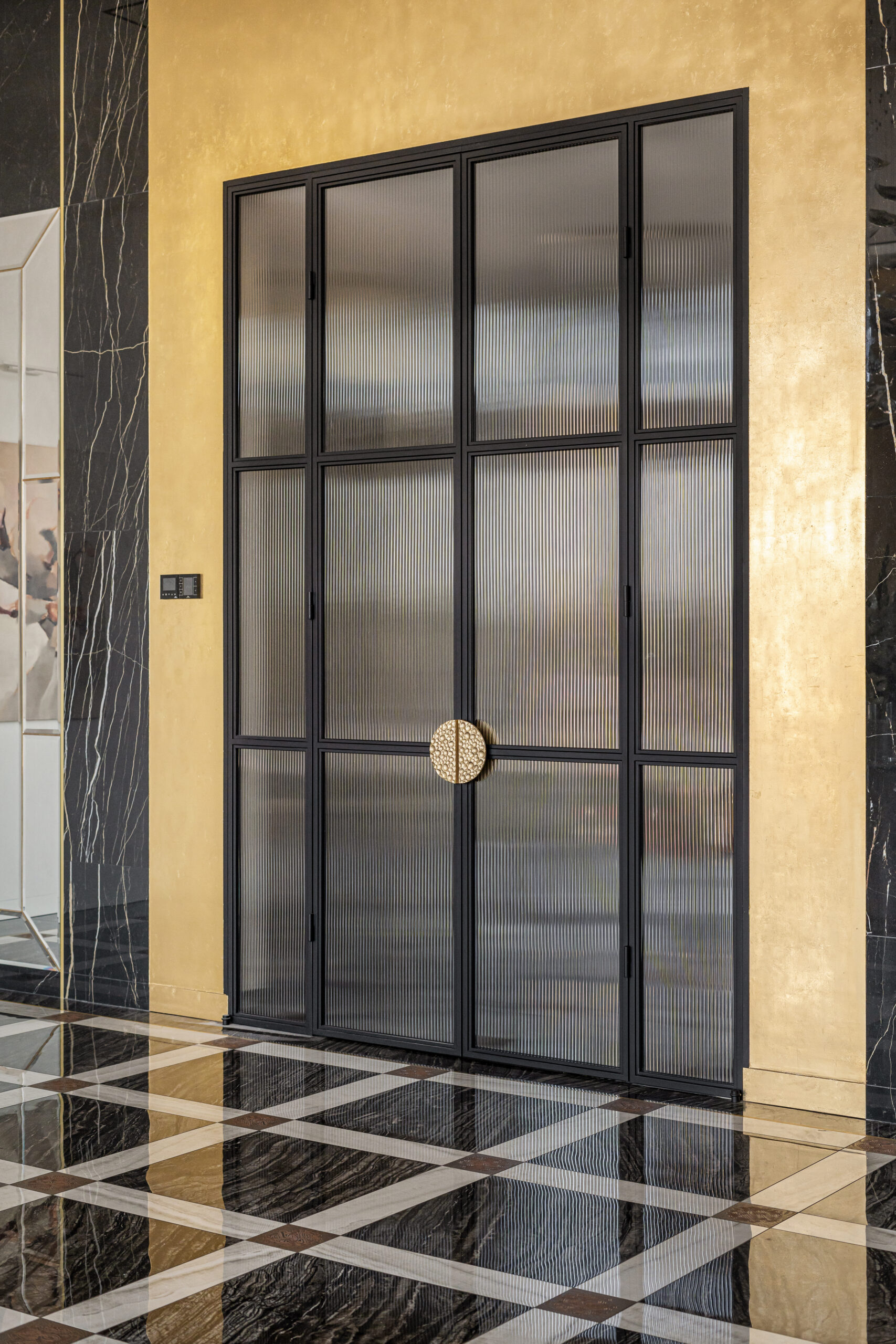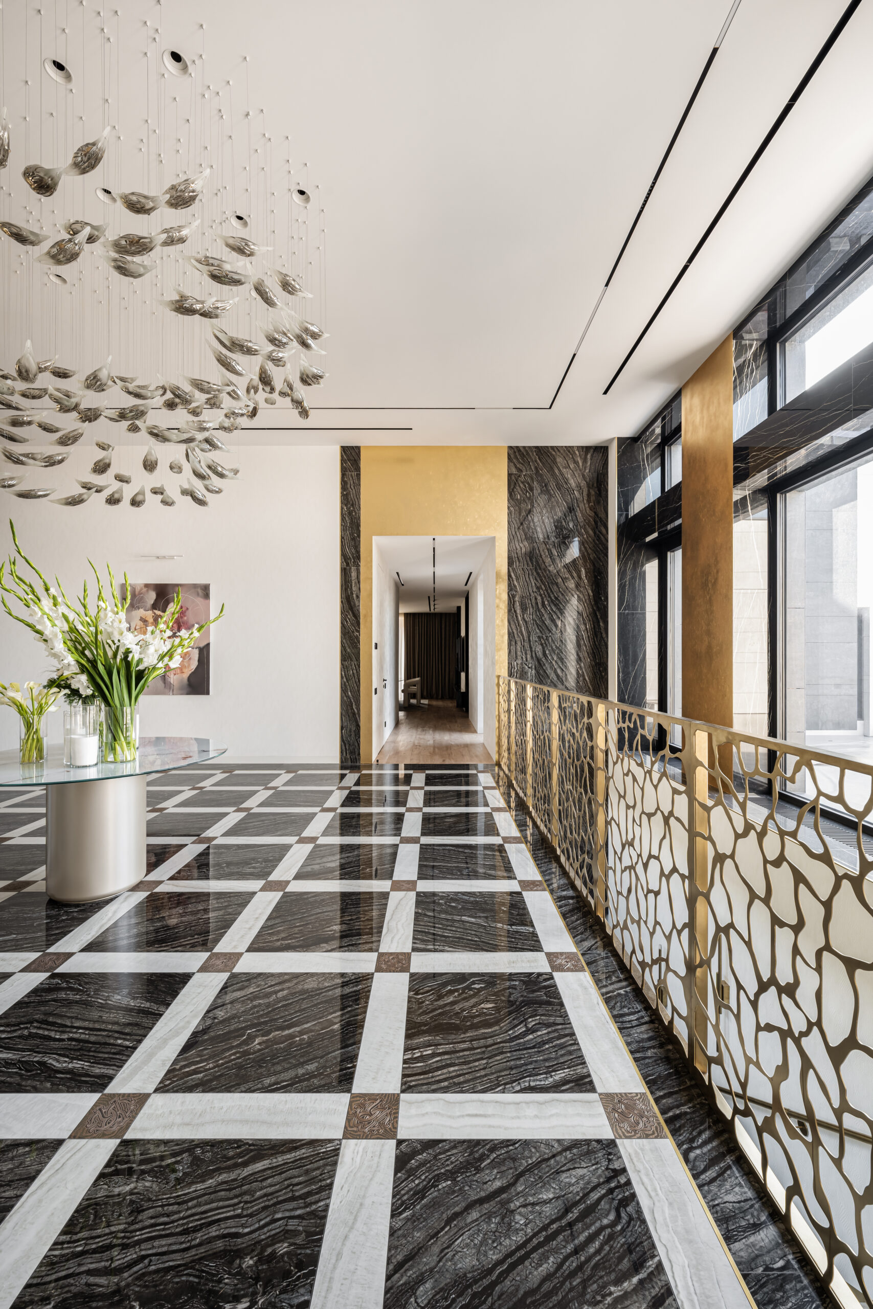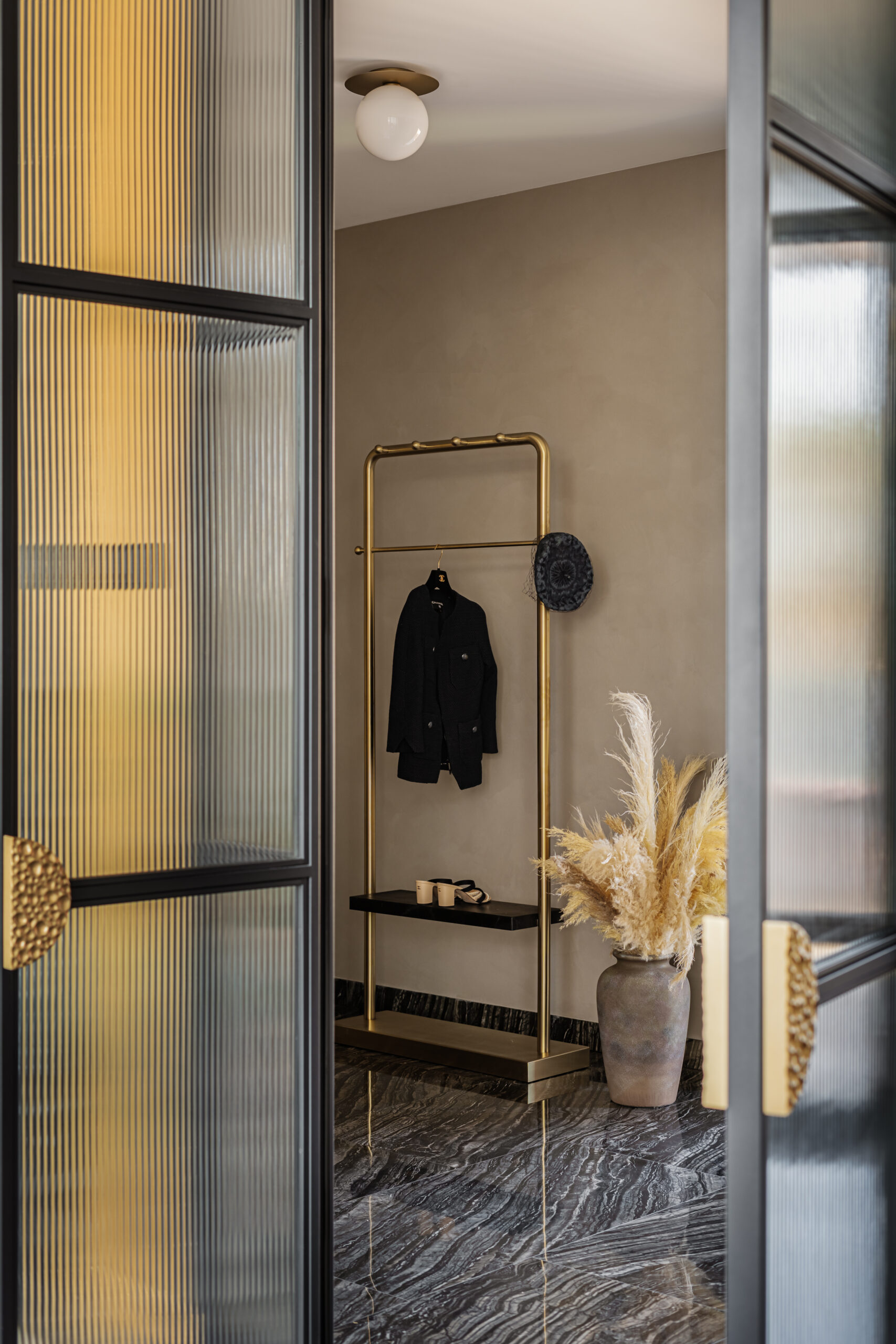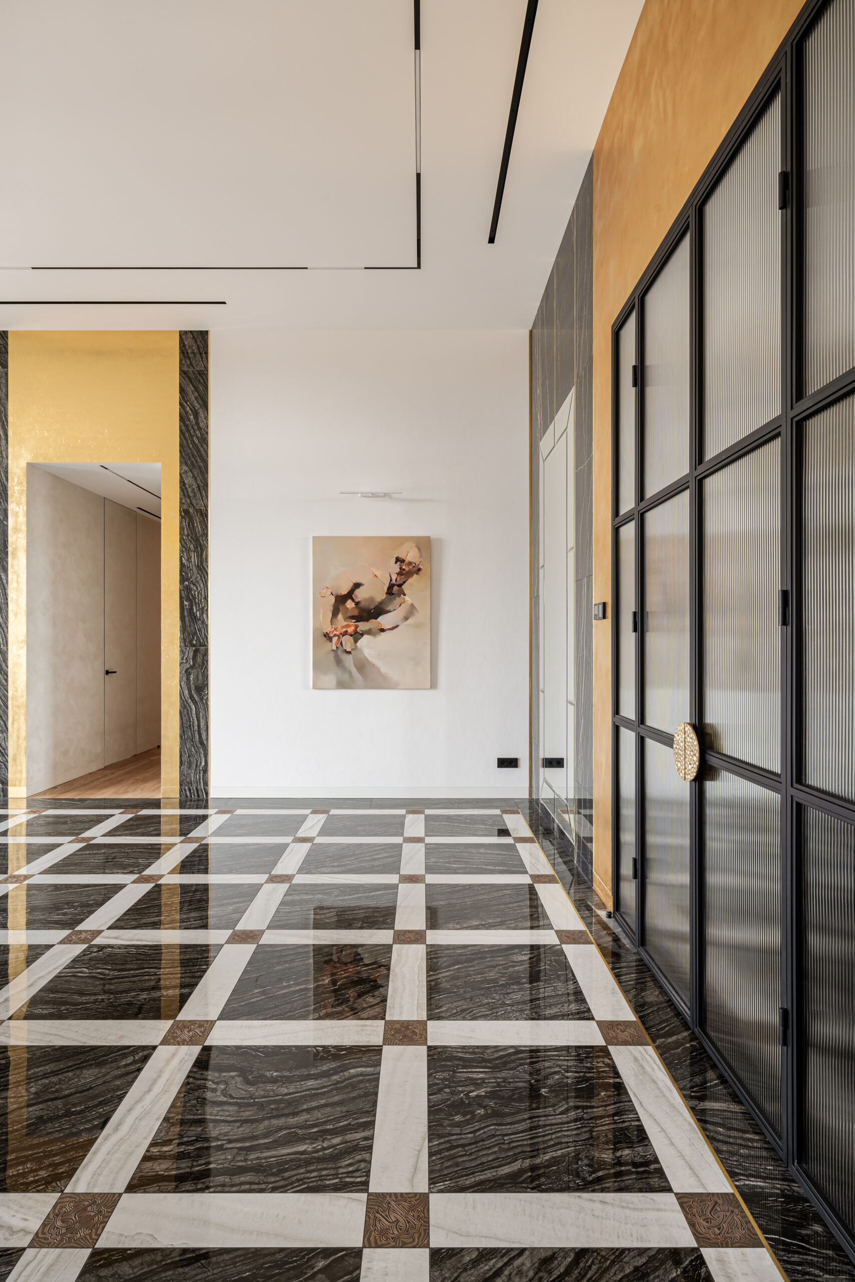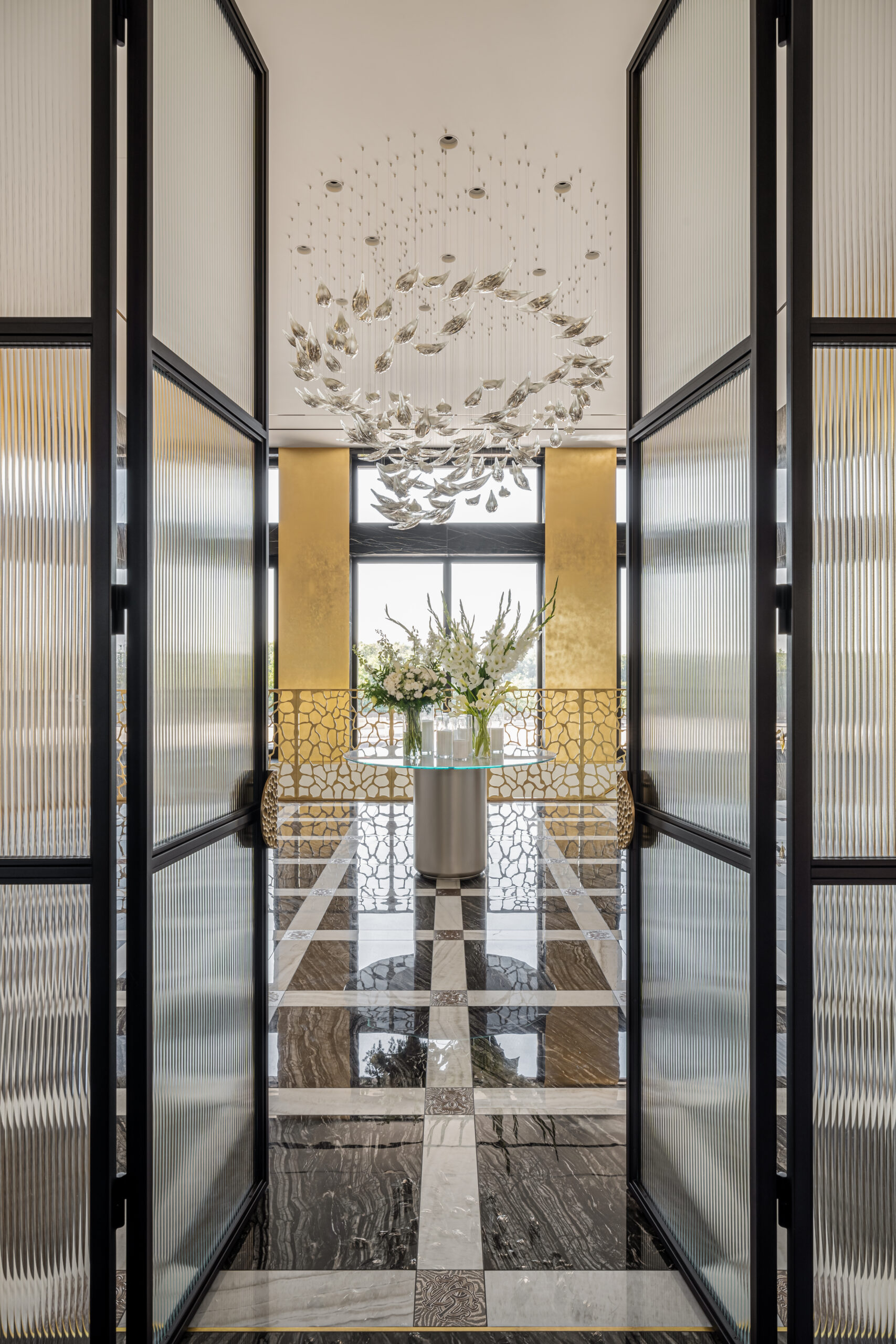 До святкового холу ведуть великі скляні двері з латунними ручками ручної роботи. Головним акцентом простору стала підвісна скляна інсталяція від Expolight із програмованими сценаріями освітлення, що змінюють атмосферу. Металеві поручні, виготовлені за індивідуальними ескізами, мають покриття з нітриду титану, а золота поталь на порталах і простінках додає урочистості. Завершують композицію бра від DCW Editions.