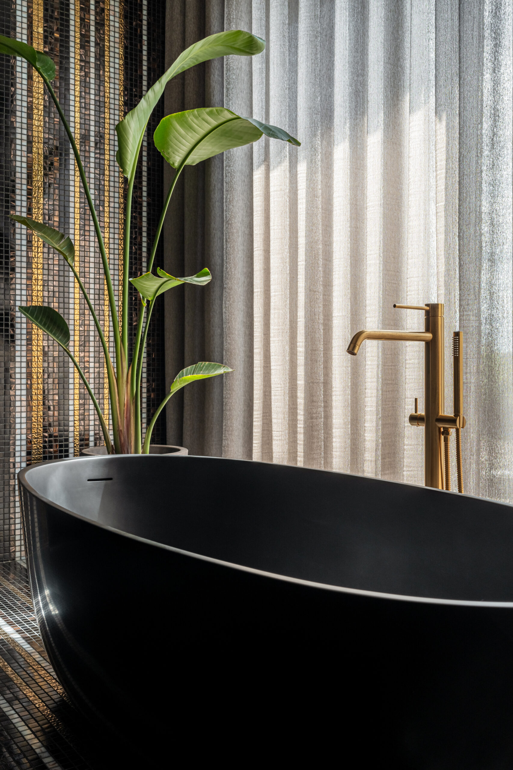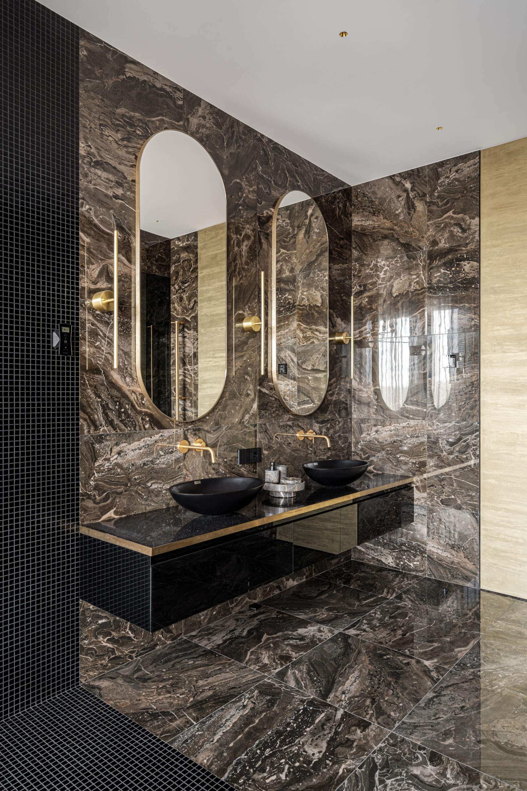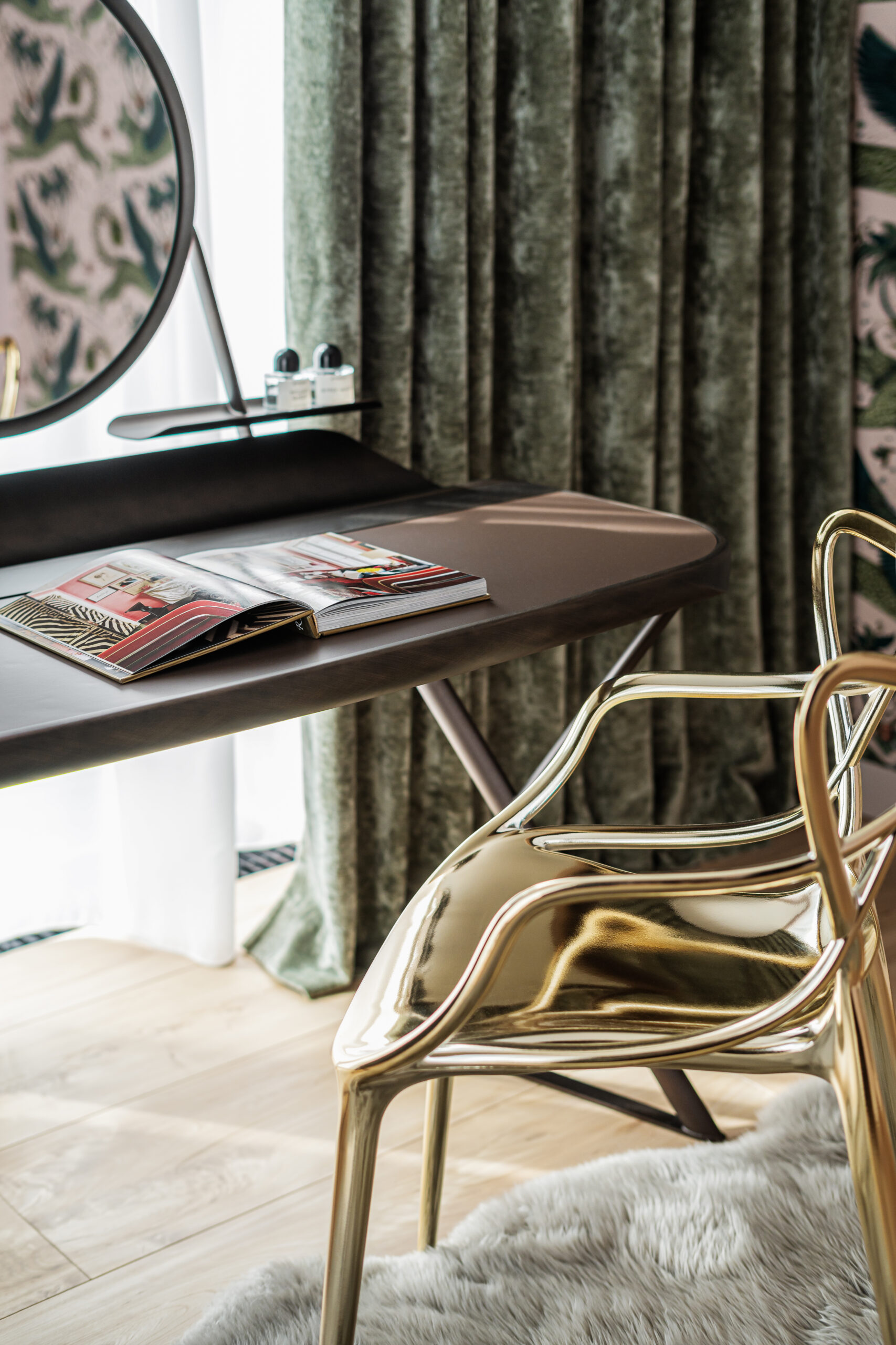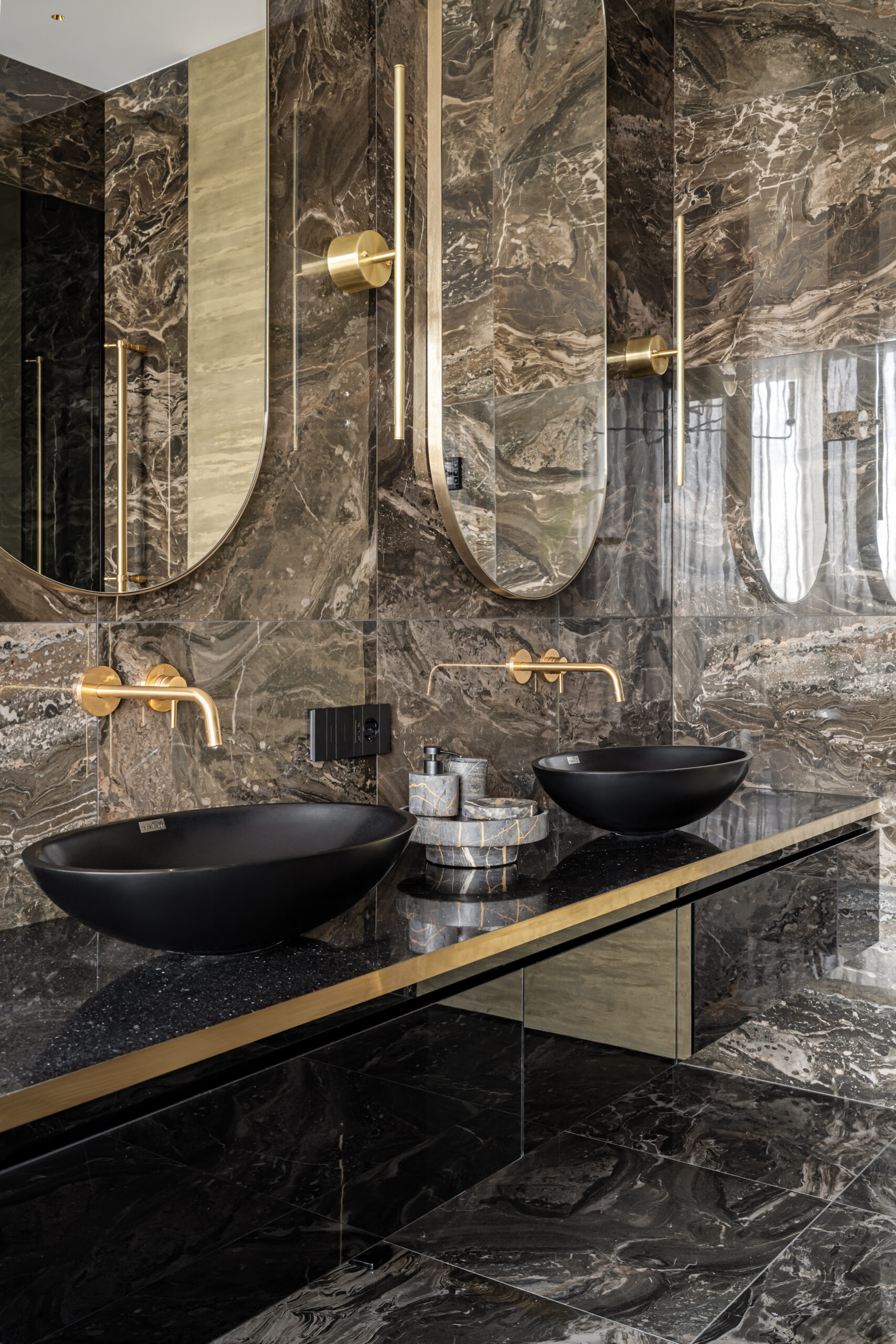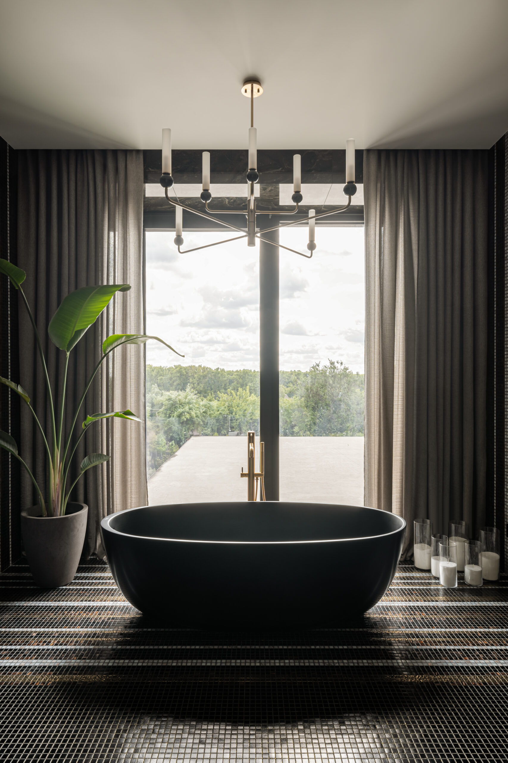 Особливим місцем для замовниці стала ванна кімната. Ванна Relax Design розташована біля вікна з краєвидом на зелені схили. Світлові сценарії — від святкового з люстрою Aromas del Campo до нюансного підсвічування та хромотерапії Gessi — підсилюють атмосферу розслаблення.