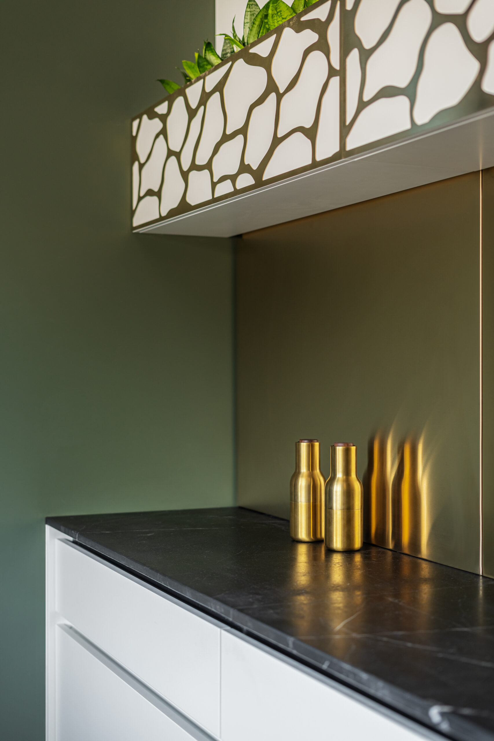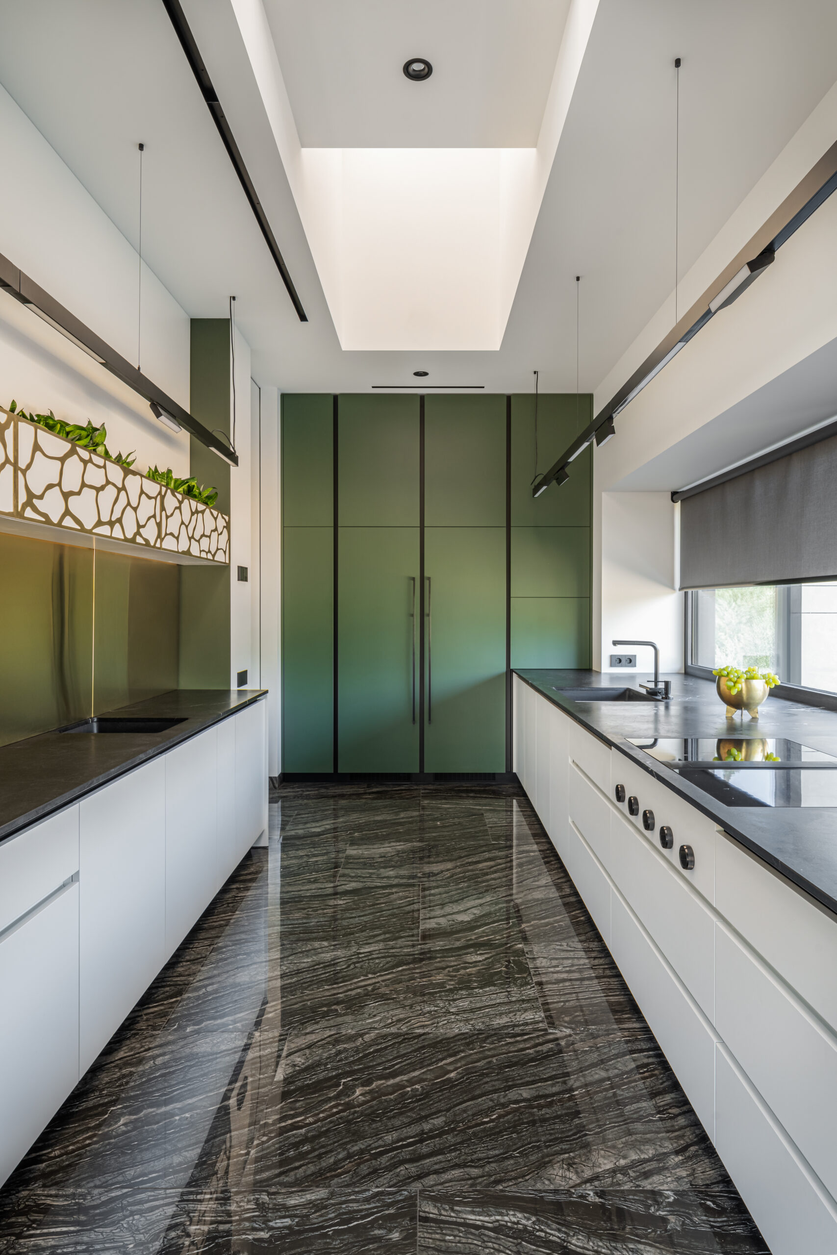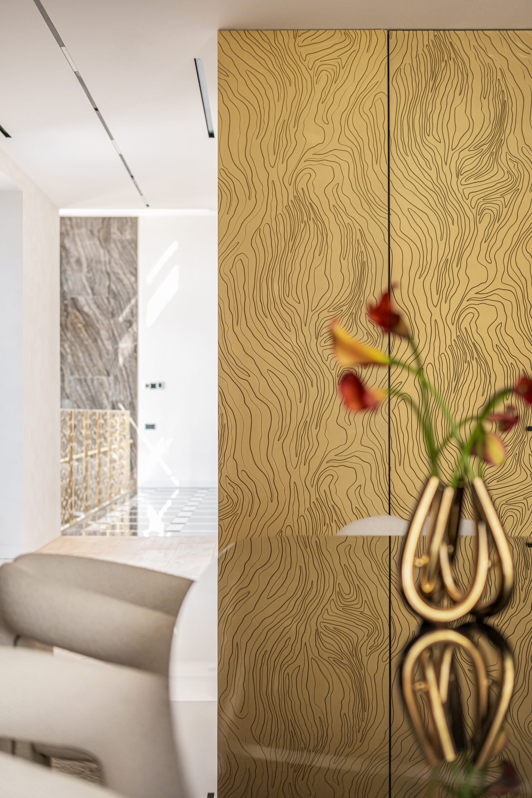 Одну зі стін їдальні оздобили металізованими фрезерованими панелями з анімалістичним патерном у стилі Роберто Каваллі, що приховують входи до підсобних приміщень. Їдальню та кухню поєднує вікно, яке на кухонному боці є частиною підйомних металевих фасадів, що приховують функціональний фартух. Мінімалістична кухня позбавлена навісних шаф, а стільниці виконані з фактурного мармуру.