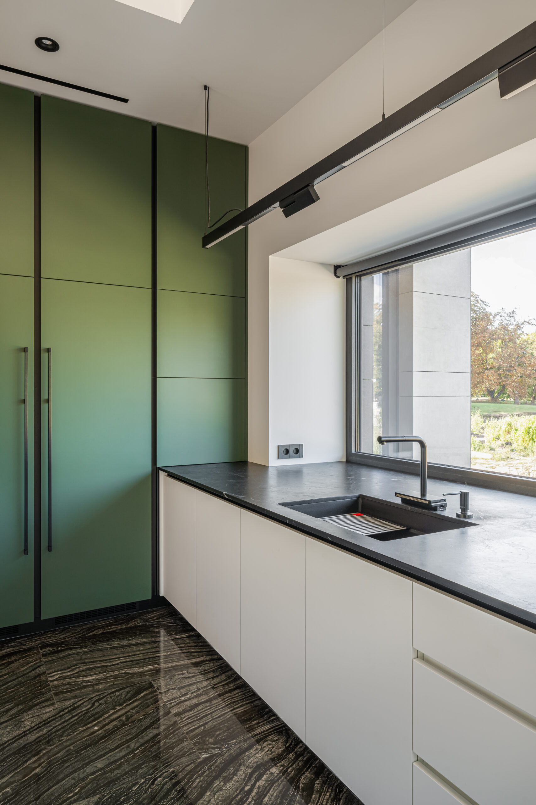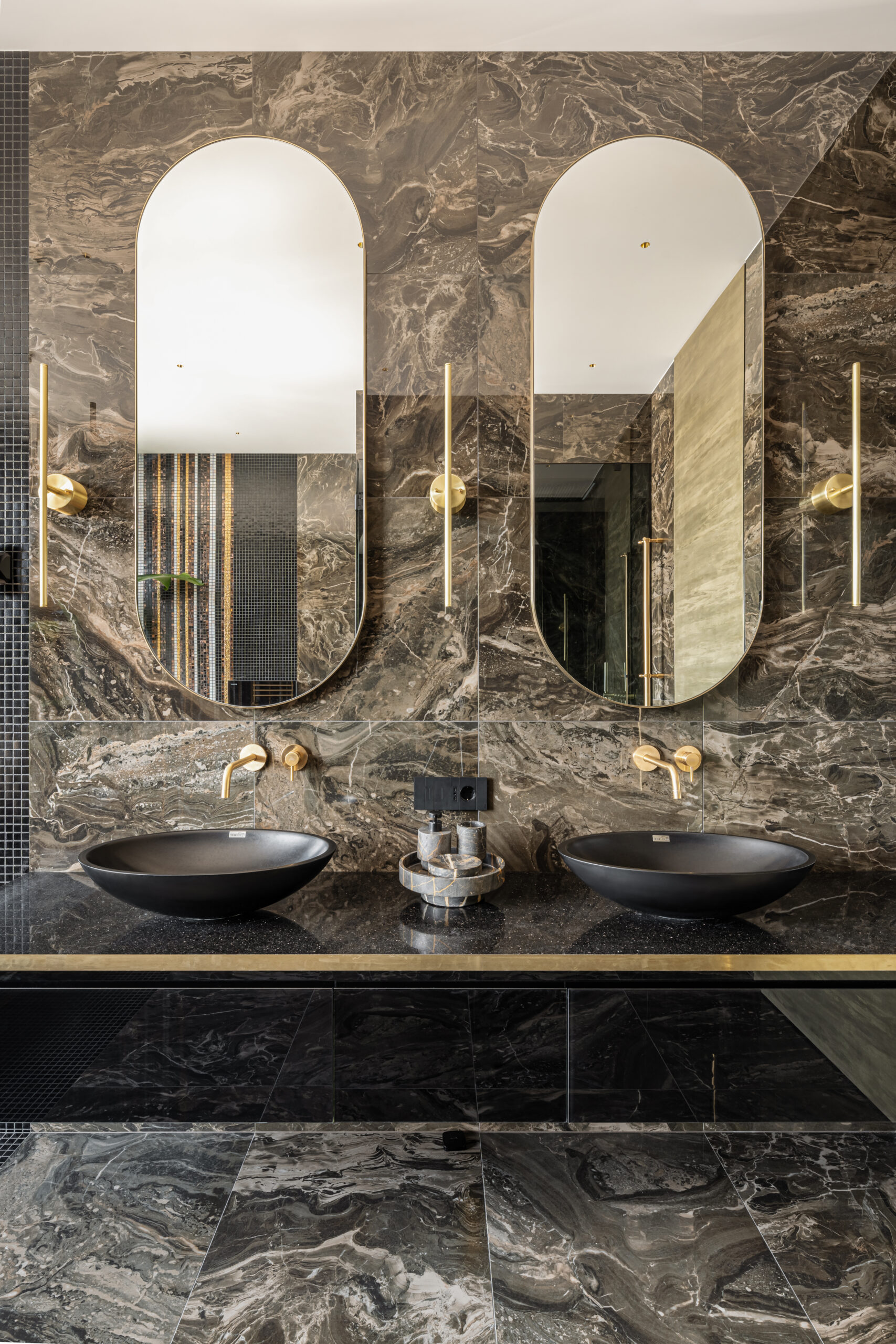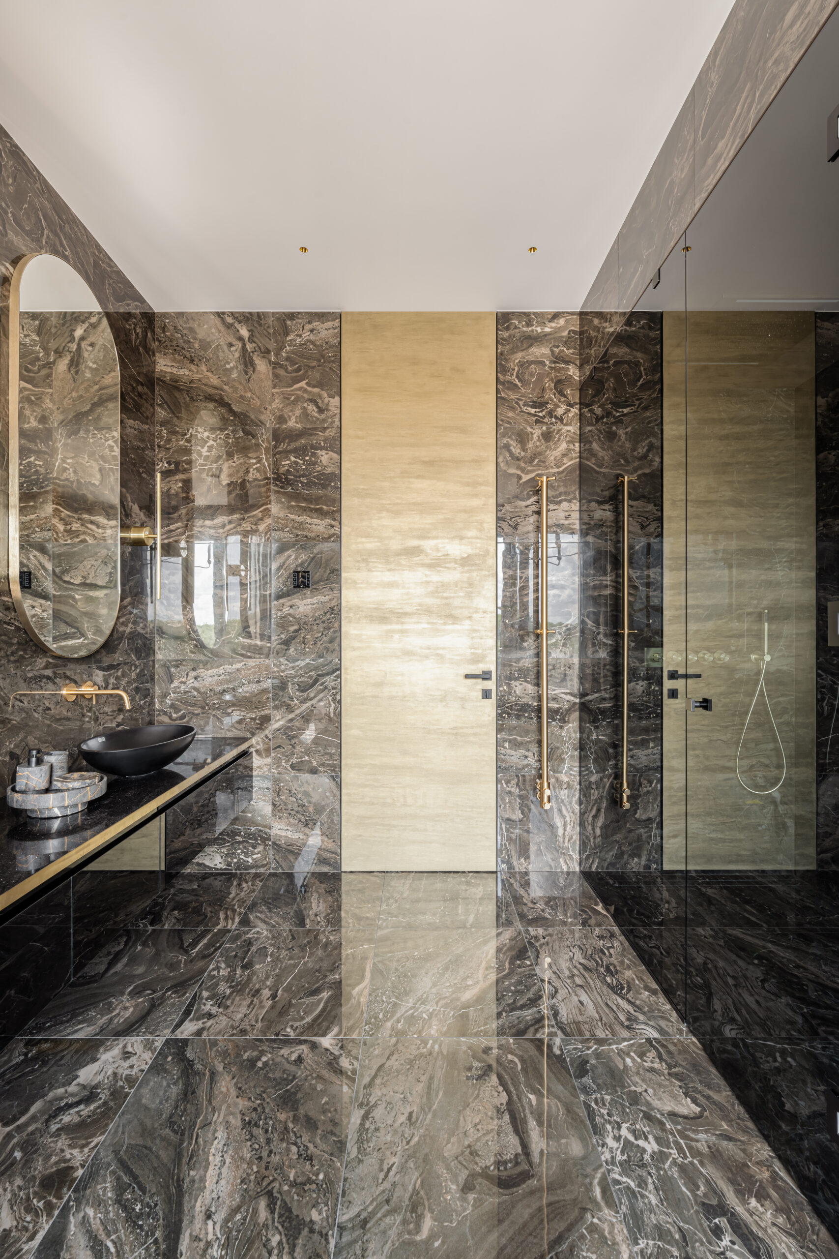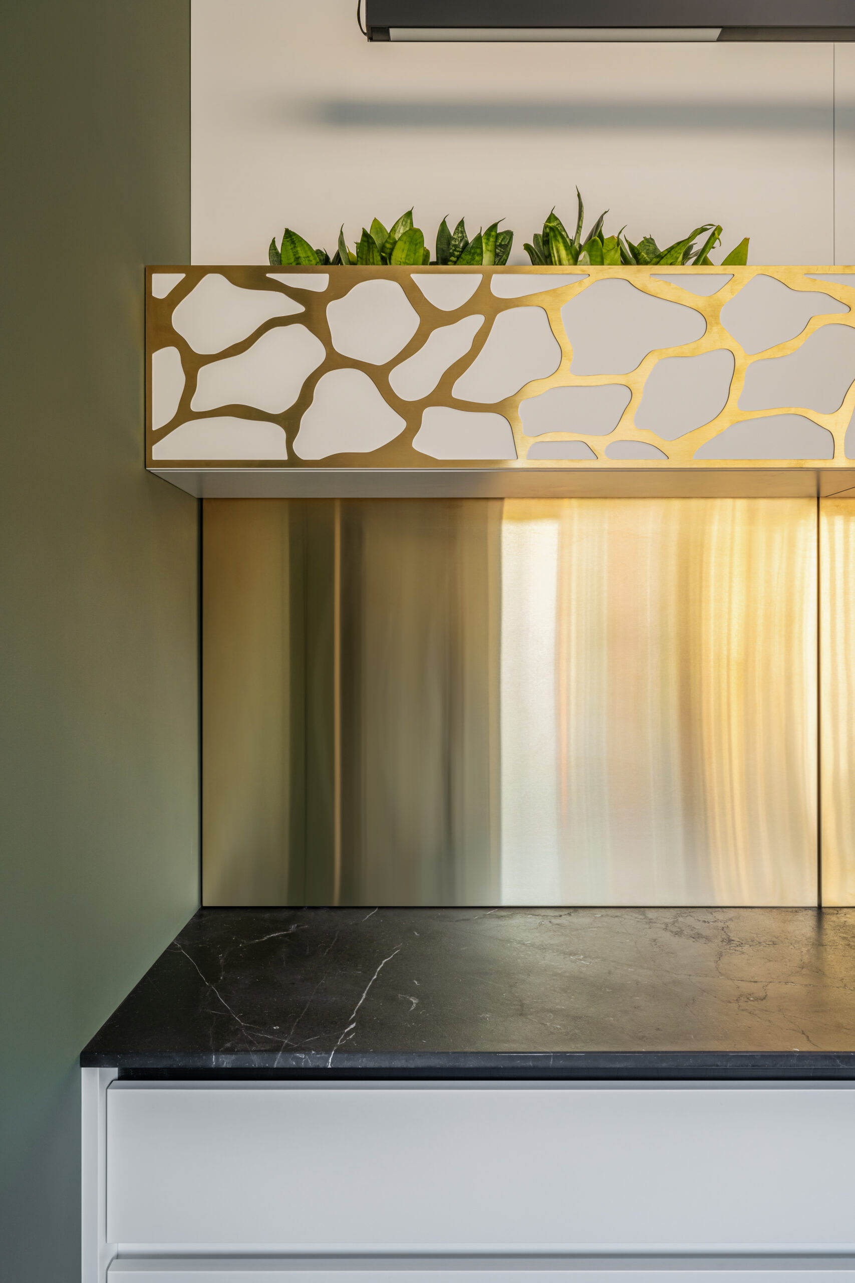 Одну зі стін їдальні оздобили металізованими фрезерованими панелями з анімалістичним патерном у стилі Роберто Каваллі, що приховують входи до підсобних приміщень. Їдальню та кухню поєднує вікно, яке на кухонному боці є частиною підйомних металевих фасадів, що приховують функціональний фартух. Мінімалістична кухня позбавлена навісних шаф, а стільниці виконані з фактурного мармуру.