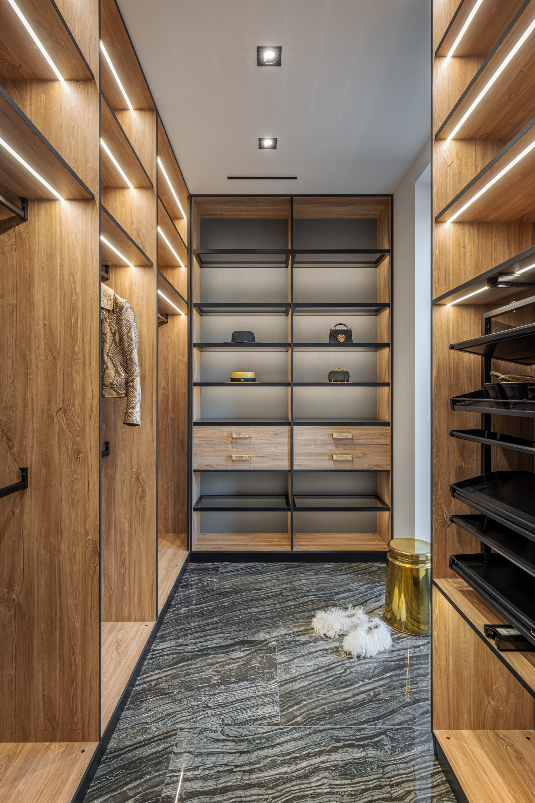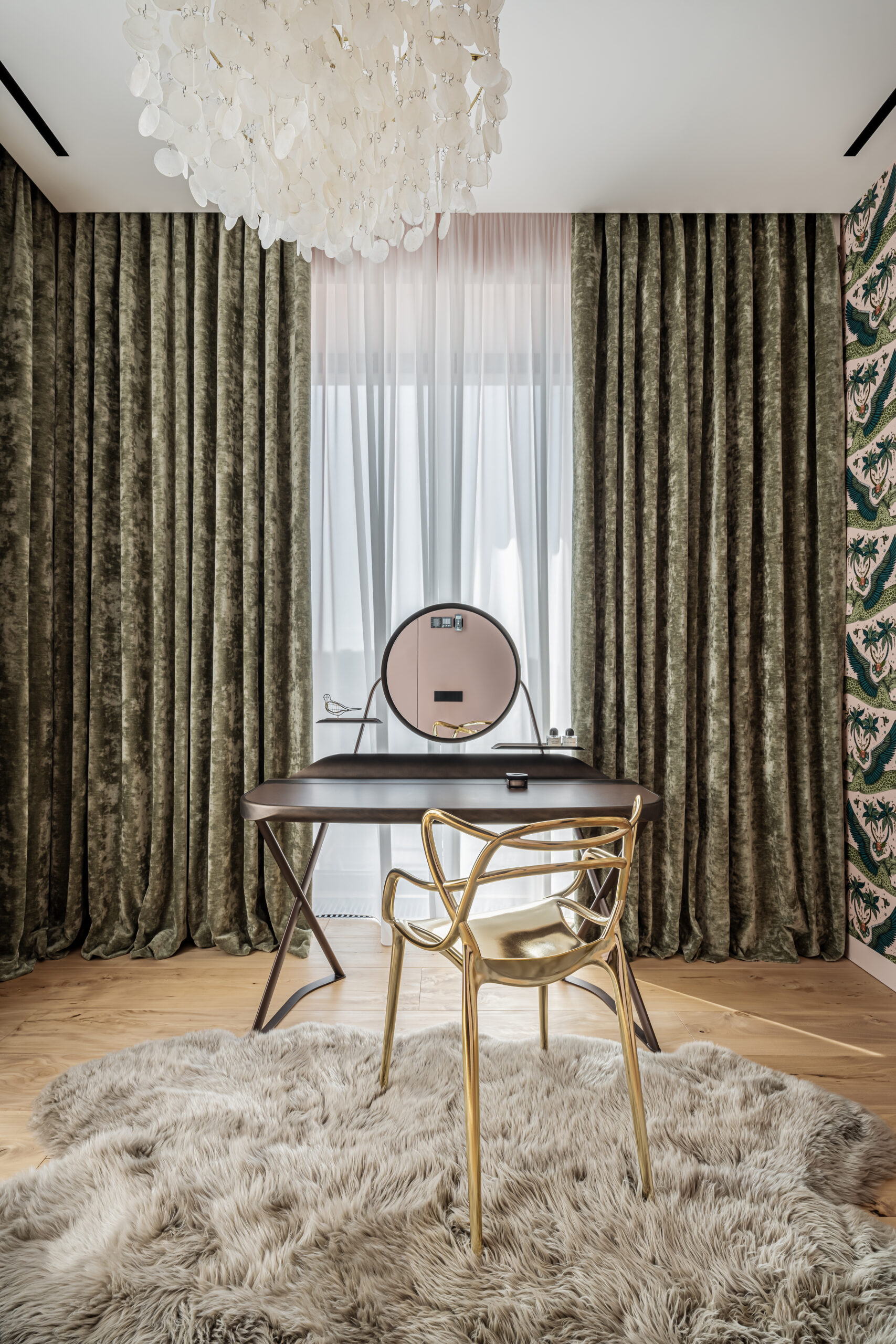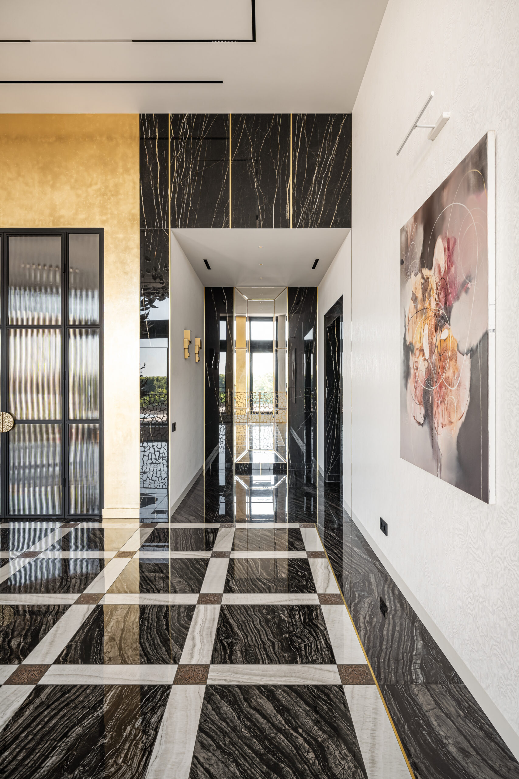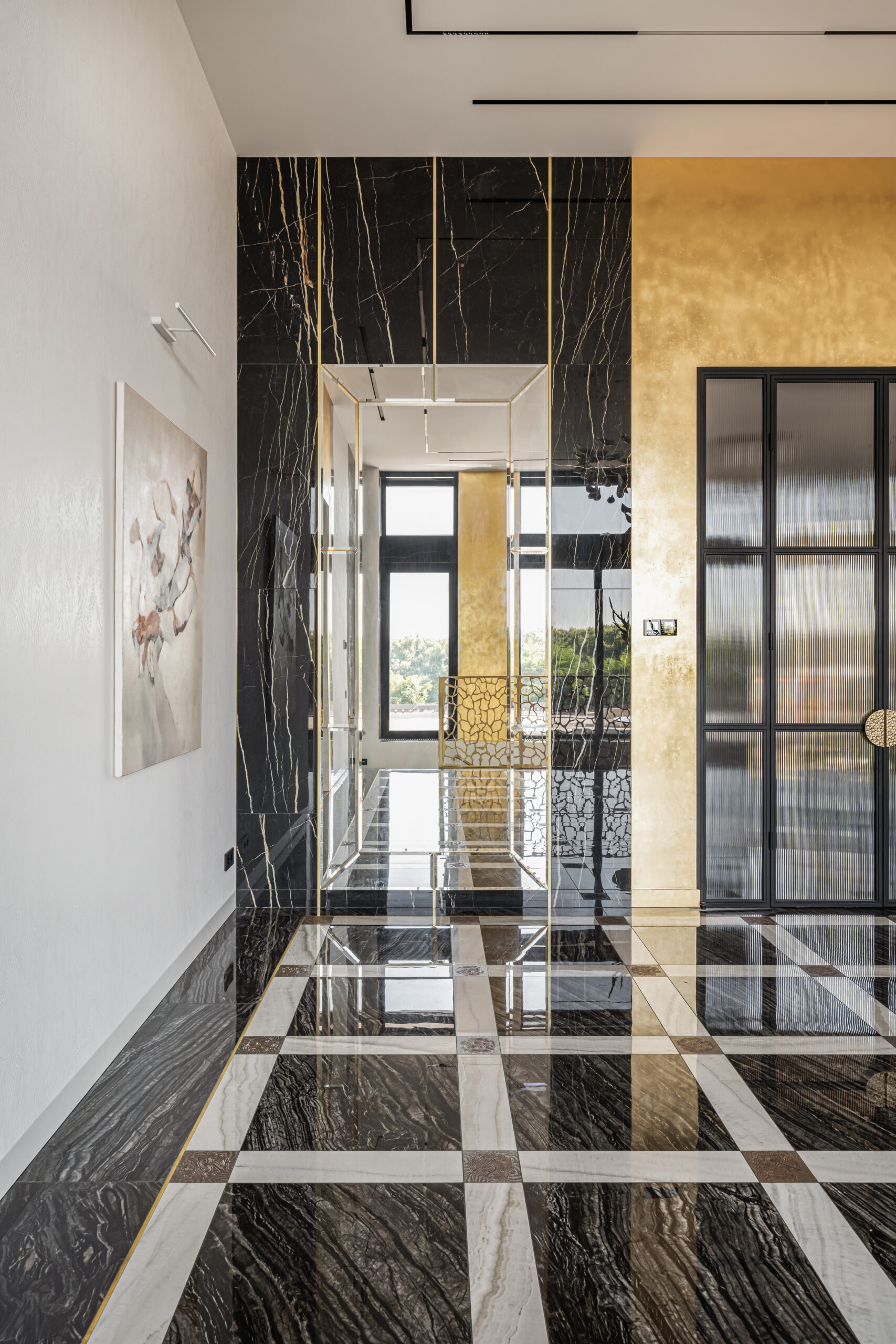 Цей приватний будинок, розташований у Києві, створений для родини з двома дітьми та двома котами. Дизайнерці Анастасії Лукашовій стояло завдання втілити харизматичний характер замовниці, яка віддає перевагу сміливим поєднанням на перший погляд непоєднуваних елементів. Результатом став інтер’єр, що гармонійно об’єднує еклектику: яскраві кольори, артистичні рішення, глянцеву класику, золоті поверхні, анімалістичні мотиви, мармур та сучасний дизайн.