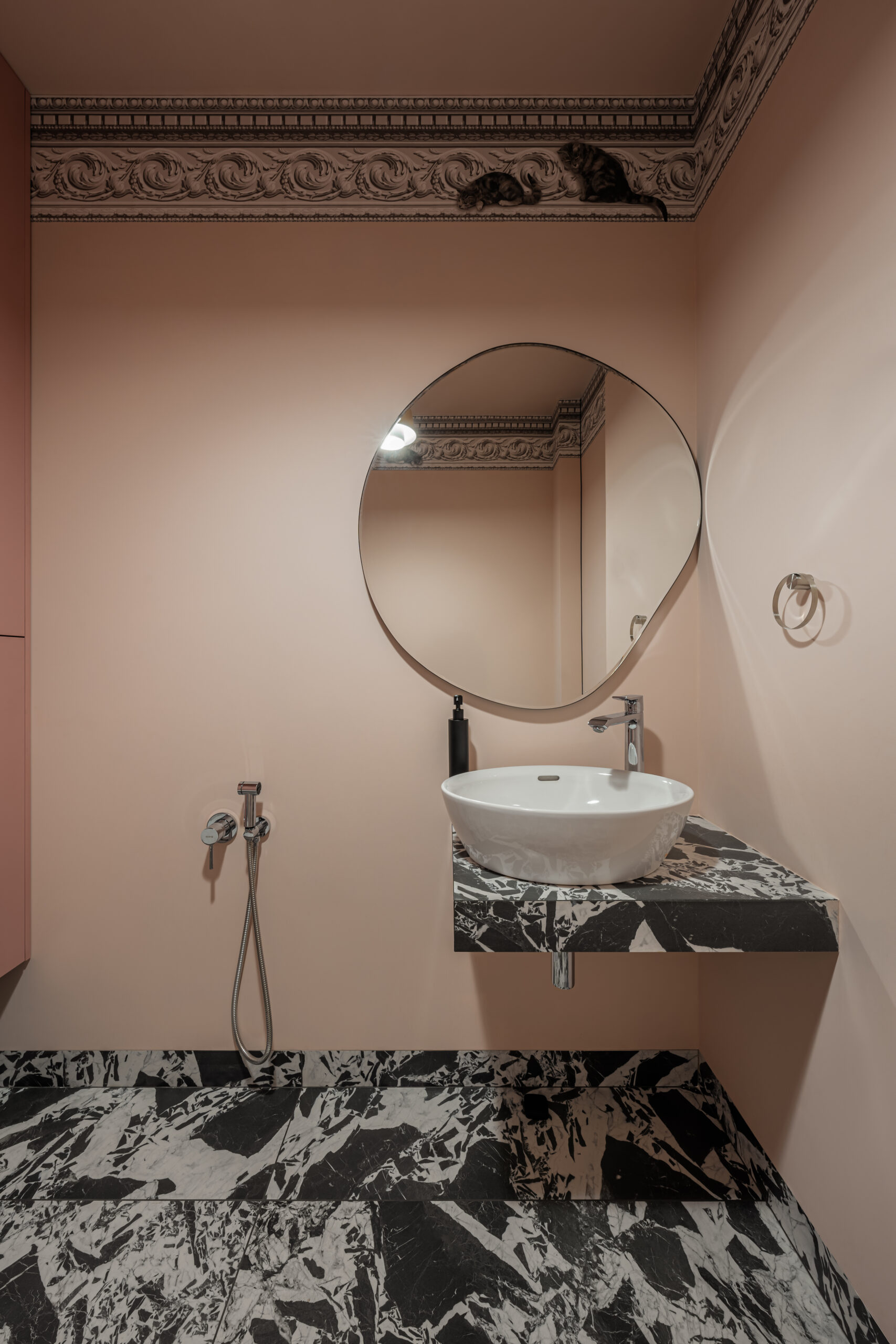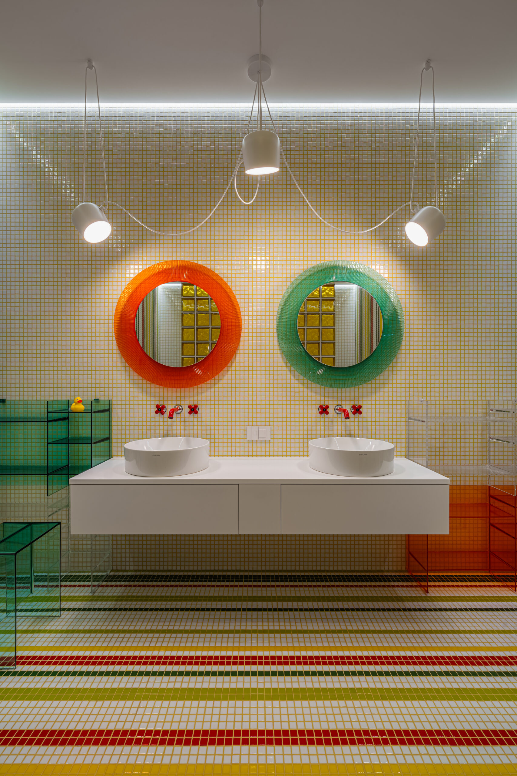 Дитяча ванна кімната стала справжнім вибухом кольорів. Єдиною умовою замовників було: “Яскраво та життєрадісно”. Стіни та підлога вкриті мозаїкою, простінок між ванною та душем зроблений із жовтих склоблоків. Акцент створює червона сантехніка Fantini, доповнена меблями та дзеркалами Laufen by Kartell. Освітленням керують підвіси Flos, бра Vibia та підсвітки.