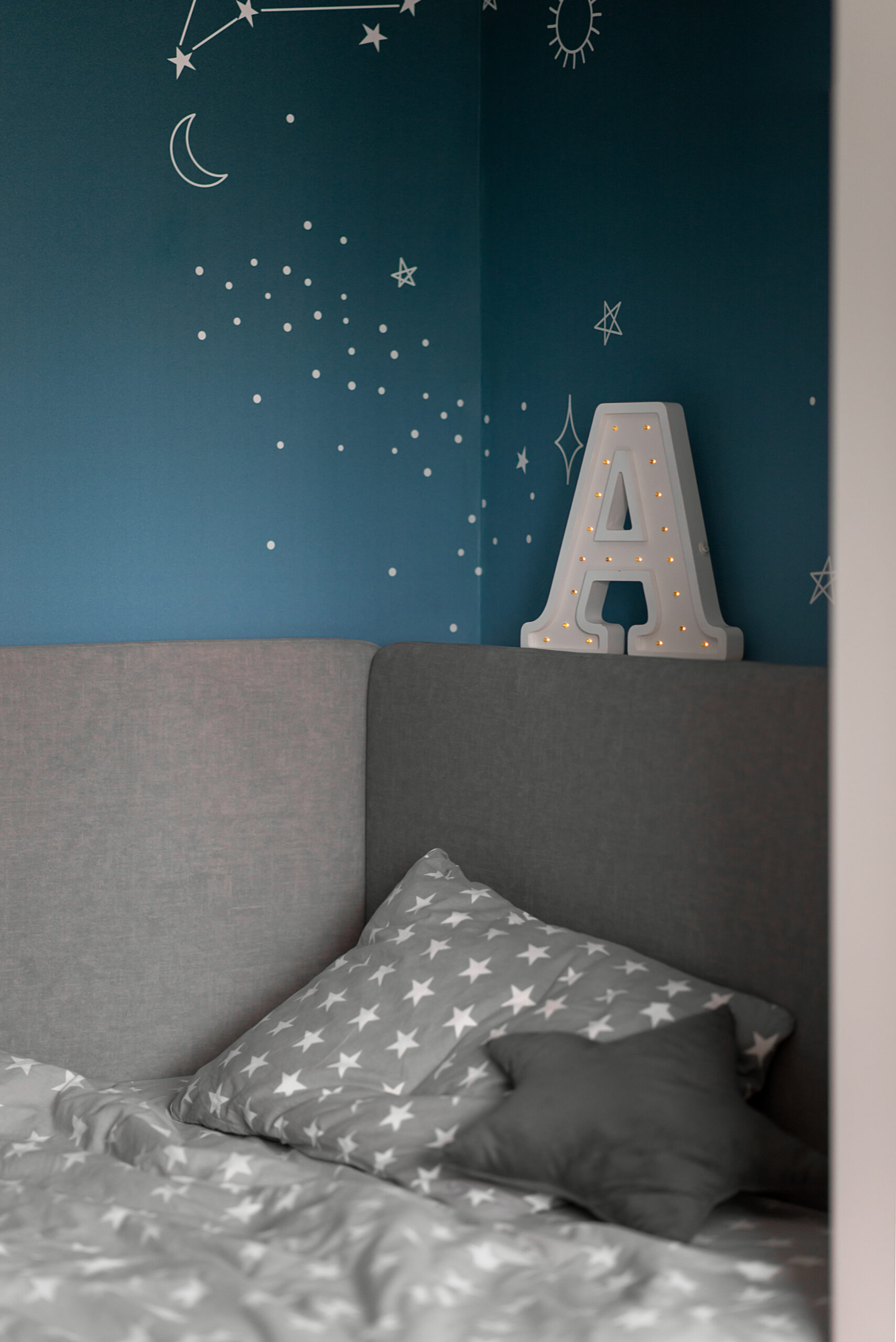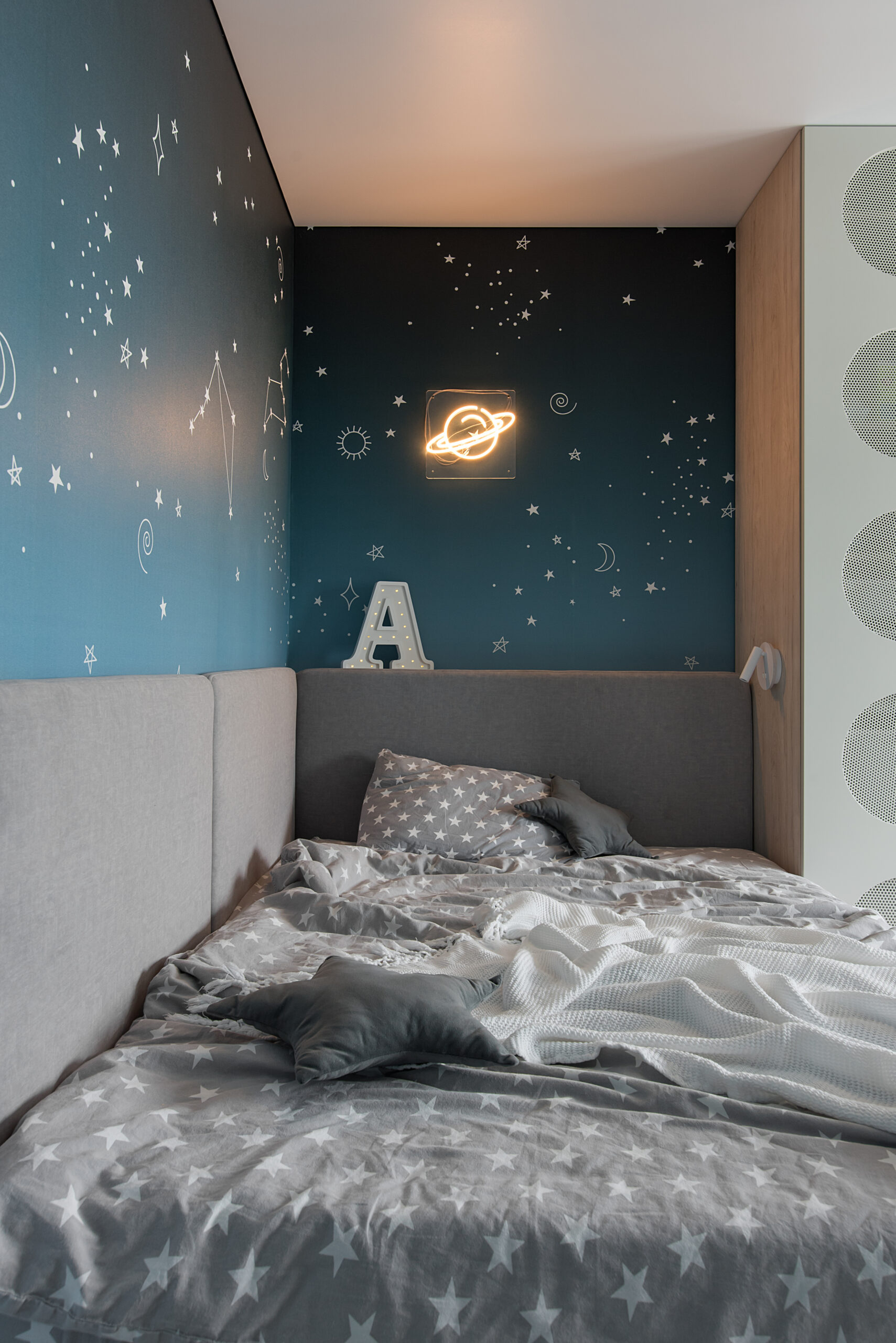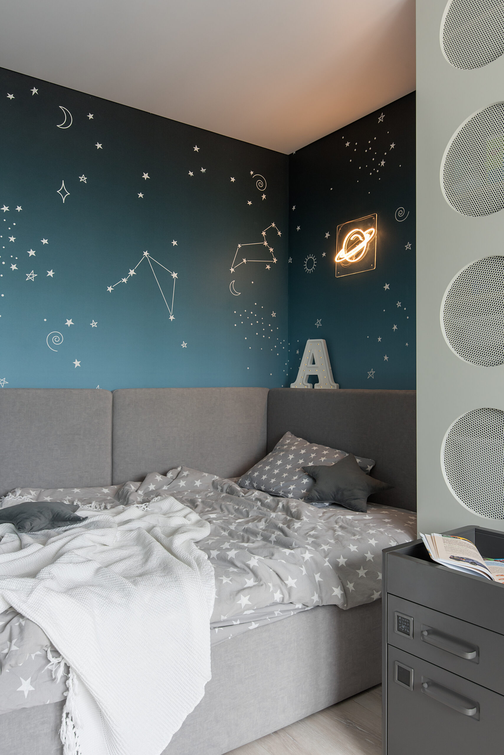 Завданням на проєктування була космічна тема, але знаючи як швидко ростуть діти, ми зробили справді космічними тільки шпалери, які легко буде змінити з часом на щось більш нейтральне