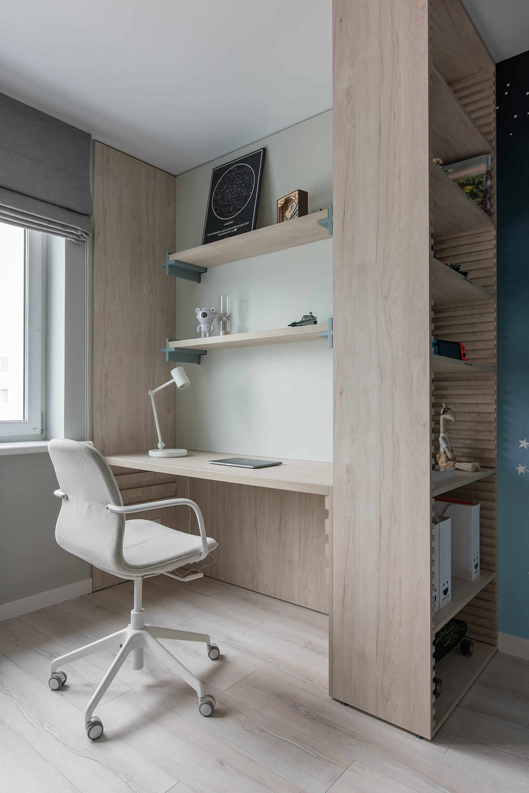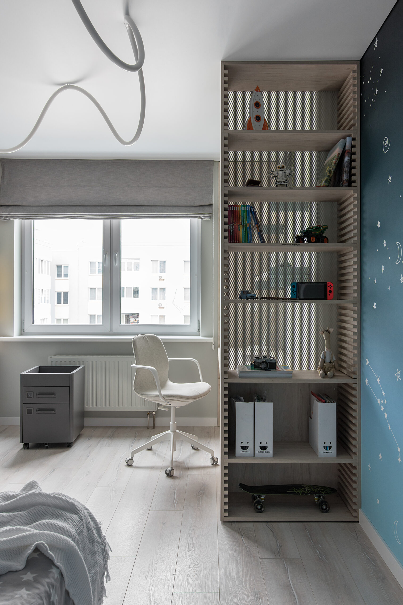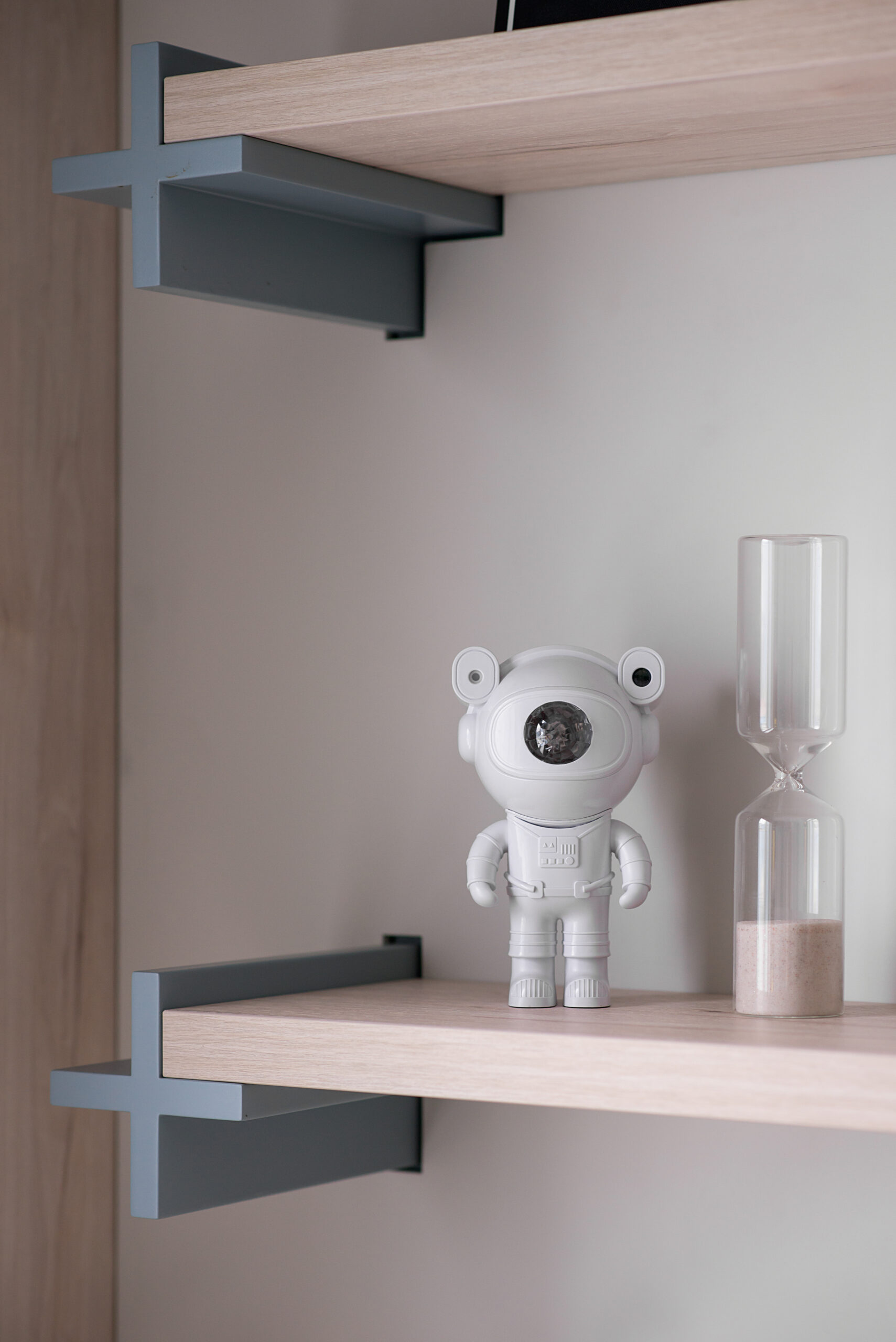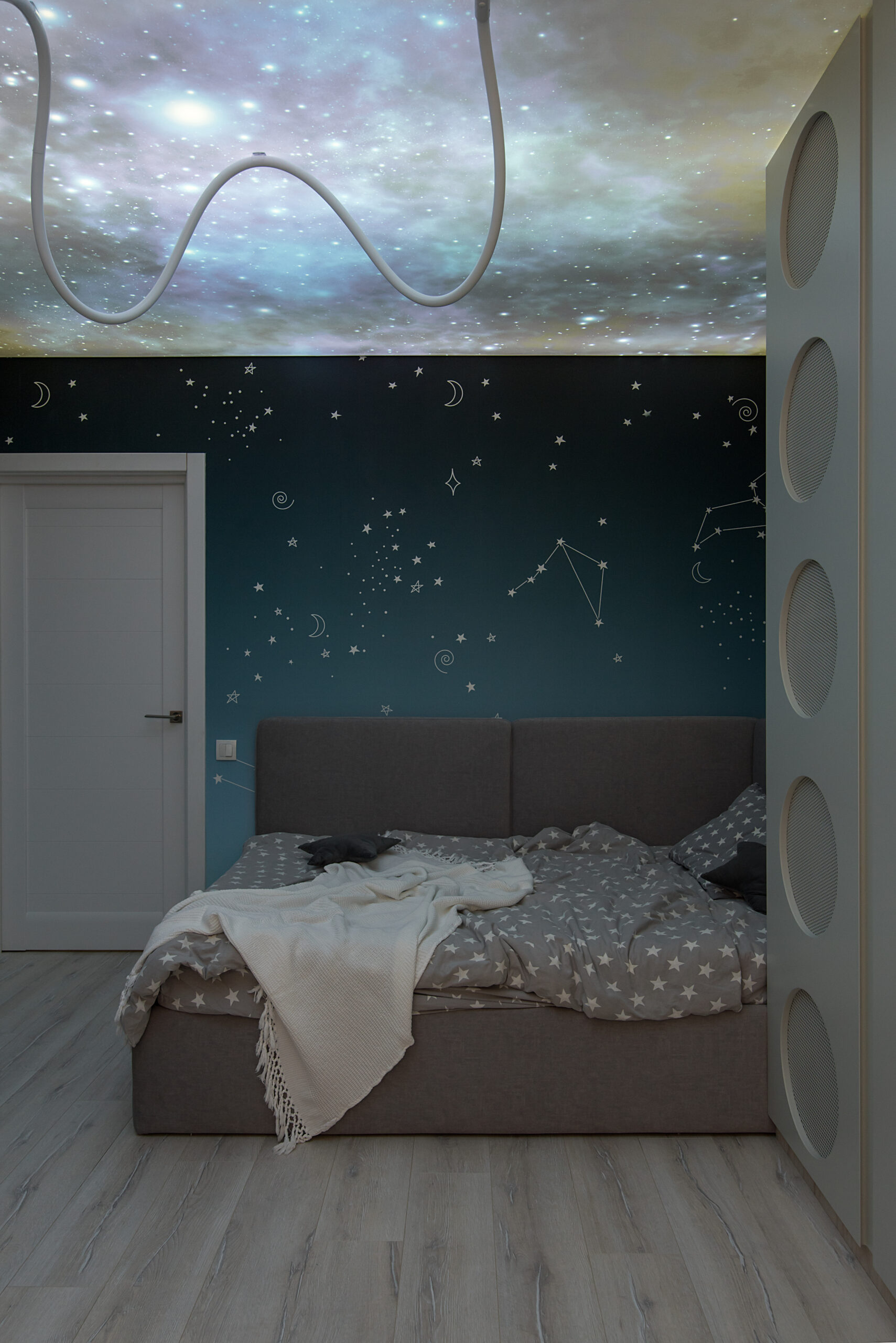 Завданням на проєктування була космічна тема, але знаючи як швидко ростуть діти, ми зробили справді космічними тільки шпалери, які легко буде змінити з часом на щось більш нейтральне